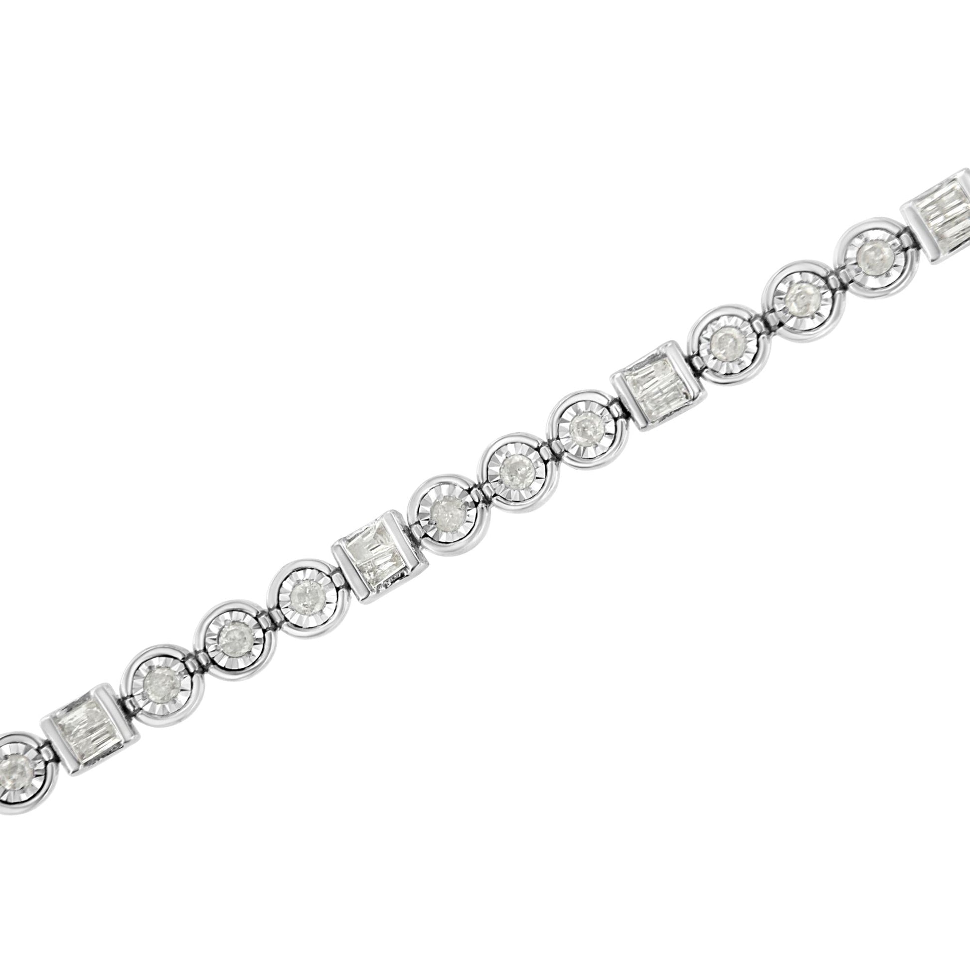 This unique diamond link bracelet has a dazzling alternating design of 3 round sterling silver links embellished with round-cut diamonds alternating with 1 sterling silver channel set with baguette-cut diamonds. This beautiful piece is set with a total of 1.0 cttw diamonds in miracle and channel settings. This diamond bracelet is the perfect addition to any jewelry collection.