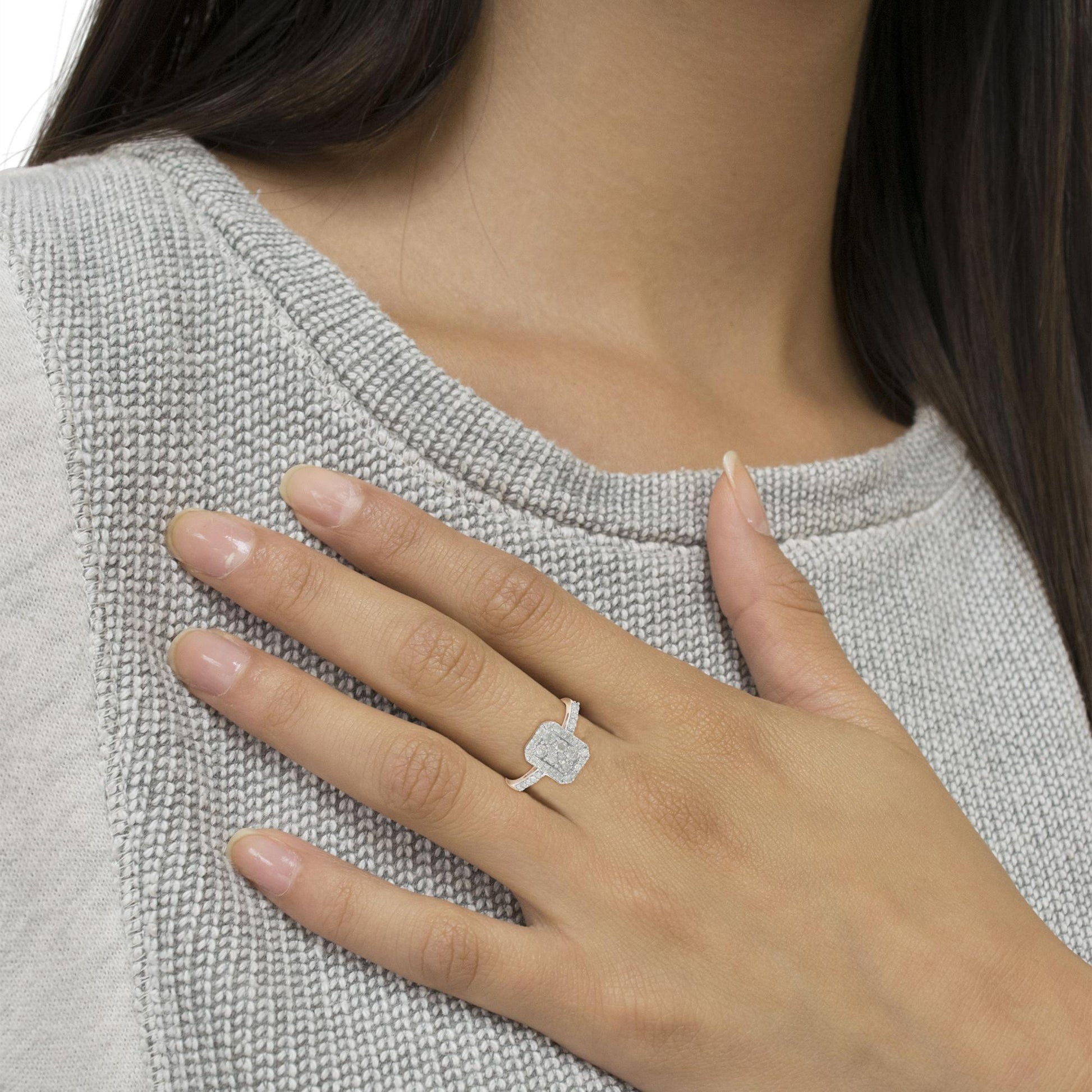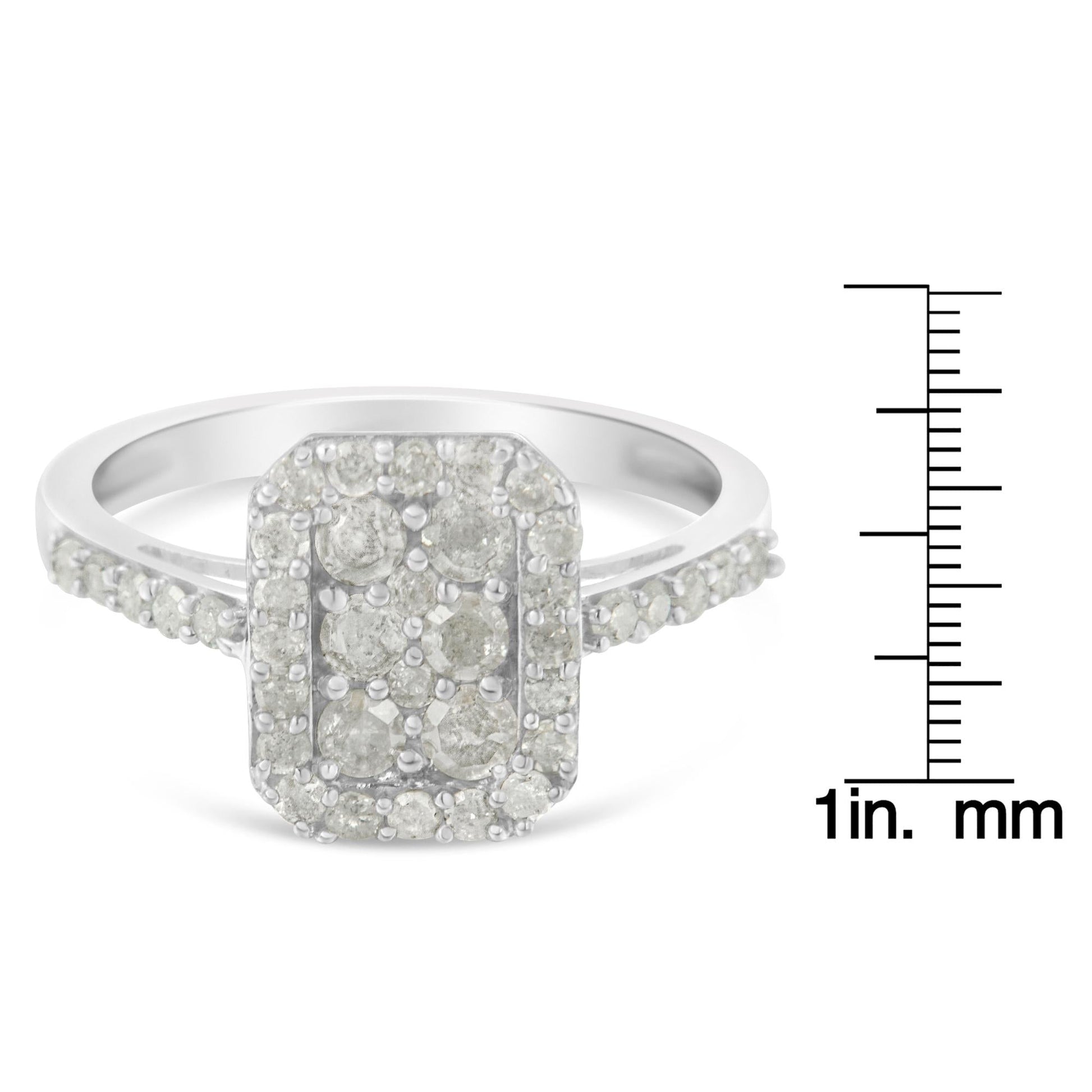 Elegant and timeless, this gorgeous 92.5% sterling silver and diamond cocktail ring features 1.0 carat total weight of diamonds with a whopping 38 individual gemstones. The fashion ring features an emerald cut gemstone shaped cluster of round brilliant cut diamonds inside an emerald shaped halo. The shank is studded with five white diamonds each. The cathedral style band has a simple geometric openwork gallery. This classic, feminine cocktail ring makes a great gift for any special occasion! Whether worn for daytime glamour or evening sparkle, this statement ring is gorgeously versatile. It can act as a promise ring or engagement ring for the woman with a bold sense of style. Give her a gift that will perfectly complement her favorite ensemble.