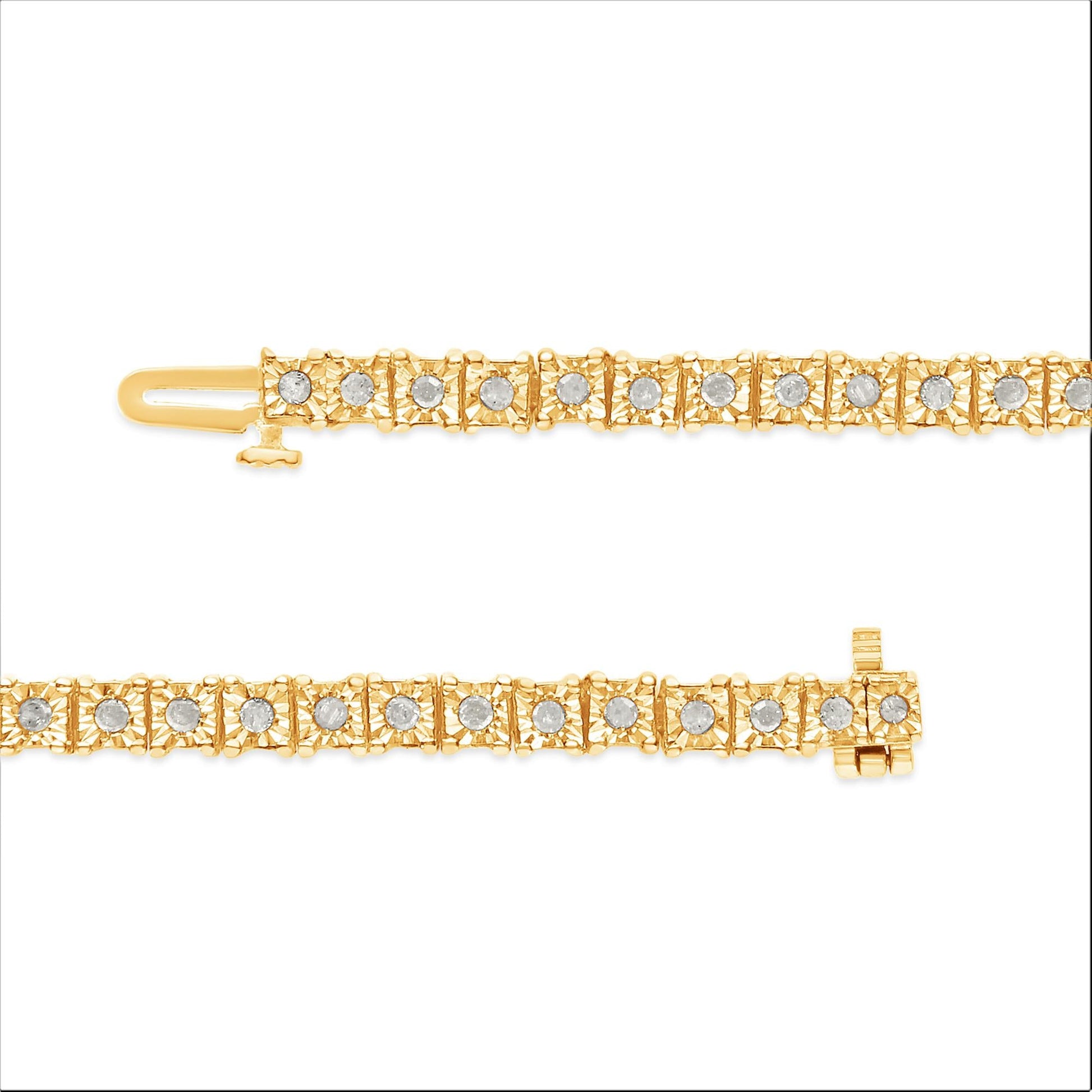 This stunning .925 sterling silver tennis bracelet boasts 1.0 cttw of sparkling diamonds, set in a elegant square frame design. The miracle-set technique used in this bracelet allows for maximum light reflection, creating a breathtakingly brilliant display on your wrist. The diamonds are naturally mined from conflict-free sources and are I-J in color and I3 in clarity, adding a touch of elegance to any outfit. The solid .925 sterling silver adds a timeless and sophisticated look to the bracelet. The 7 inch length makes it perfect for any occasion, whether it's a special event or a casual night out. Make a statement with this luxurious and glamorous diamond tennis bracelet, perfect for any jewelry collection. Fits wrists up to 7 inches.