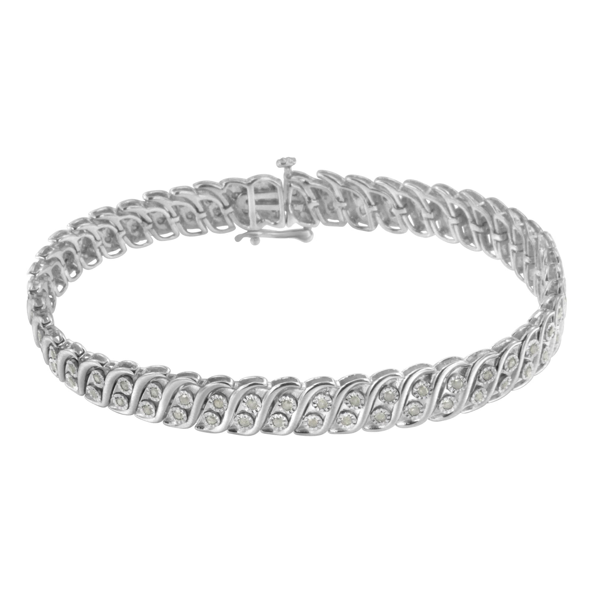 Elegant and timeless, this gorgeous sterling silver tennis bracelet features 1.0 carat total weight of round, rose cut diamonds. The tennis bracelet features S curved links with a duo of petite genuine round near colorless I-J color diamonds illusion set in a miracle plate. These genuine stones are graded at I3 clarity, which is at the lower end of the diamond clarity grading scale; they may appear more cloudy than the photo shows, with visible natural inclusions. The 7.75” bracelet fastens with a box clasp with foldover figure eight safety clip and is crafted of real 92.5% sterling silver ensuring it will shine for years to come. This classic bracelet makes a great gift for a formal dress occasion! Whether worn for daytime glamour or evening sparkle, this bracelet is gorgeously versatile. Give her a gift that will perfectly complement her favorite ensemble.