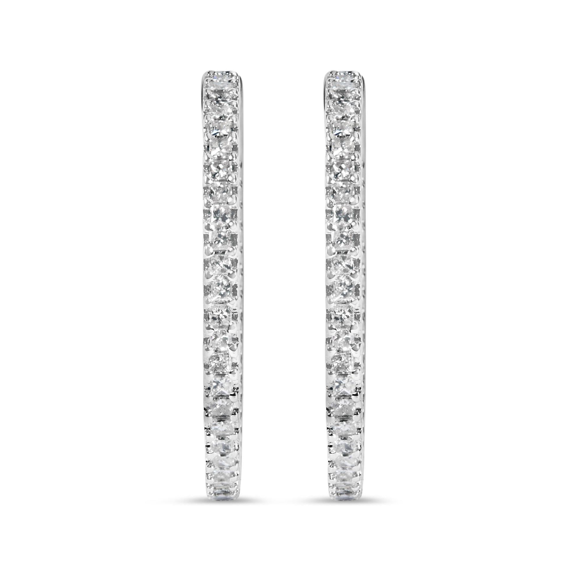 Unveil timeless elegance with these rhodium-plated .925 sterling silver hoop earrings, each measuring a poised 23 mm in diameter. Crafted with meticulous precision, they are adorned with enchanting natural princess-cut diamonds totaling 1.0 carat. These resplendent gems, boasting an I-J color and I1-I2 clarity, are thoughtfully set to captivate from both the inside and outside, amplifying their celestial glow with every turn of the head. Designed to cherish and to be cherished, these hoops secure effortlessly with a snap post mechanism, promising not just safety but an enduring grace to accompany you through every moment of life’s celebrations.