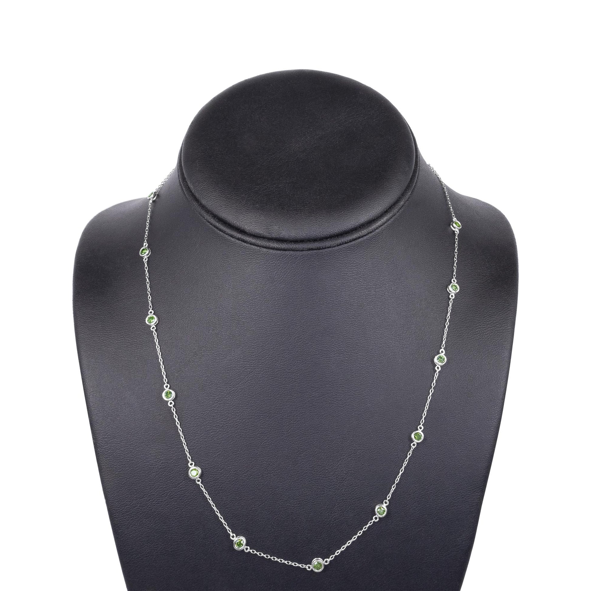 A simple yet stunning design, this diamond station necklace evokes a timeless sophistication that accents your look beautifully. These treated green diamonds sit nestled in a bezel setting in a total 1.00 cttw with an approximate I2-I3 clarity to add a subtle pop of color to your ensemble. Made from .925 sterling silver, everything about this looks speaks of eloquence. The 18" rolo chain with spring ring clasp complements any neckline beautifully.