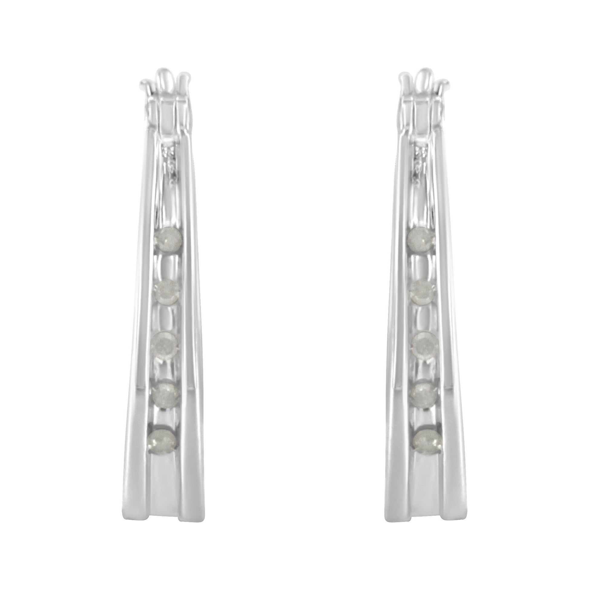 Elegant and timeless, these gorgeous sterling silver diamond hoop earrings feature 0.10 carat total weight of round diamonds. Each U shaped earring is set with five stones in a channel setting. The ten round diamonds are each set in the center of deep groove that amplifies & reflects the natural beauty of the stone. The gems in this set are natural, earth mined I-J color diamonds. These genuine stones are graded at I3 clarity, which is at the lower end of the diamond clarity grading scale; they may appear more cloudy than the photo shows, with visible natural inclusions. The locking clip style posts are perfect for pierced ears. This classic versatile pair of drops are the perfect gift for any occasion or milestone!