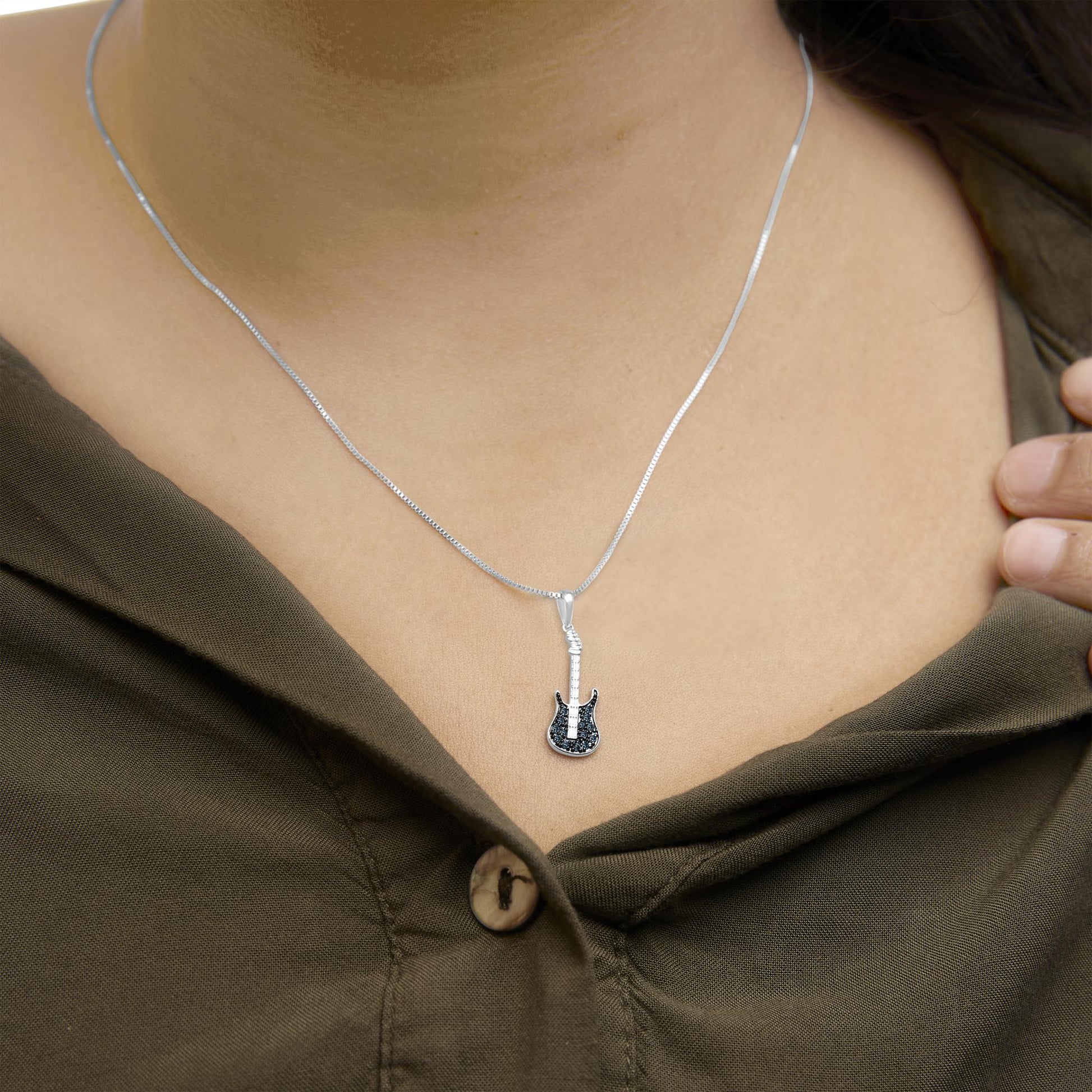 Unleash the melody of style with this exquisite guitar-shaped pendant, masterfully crafted from rhodium-plated 925 sterling silver for a lustrous finish that promises durability. Adorned with natural diamonds, ingeniously treated to flaunt a captivating blue hue, this pendant captures the essence of both innovation and tradition. The blue diamonds, sparkling with an I2-I3 clarity, animate the silhouette of the guitar, creating a symphony of light with every movement. Suspended from an elegant 18-inch cable chain that secures with a spring ring clasp, this pendant necklace is not just jewelry; it's a statement of artistry and individuality. Ideal for both budding musicians and the fashion-forward, it offers a unique blend of charm and chic sophistication, striking the perfect chord to enhance any ensemble.