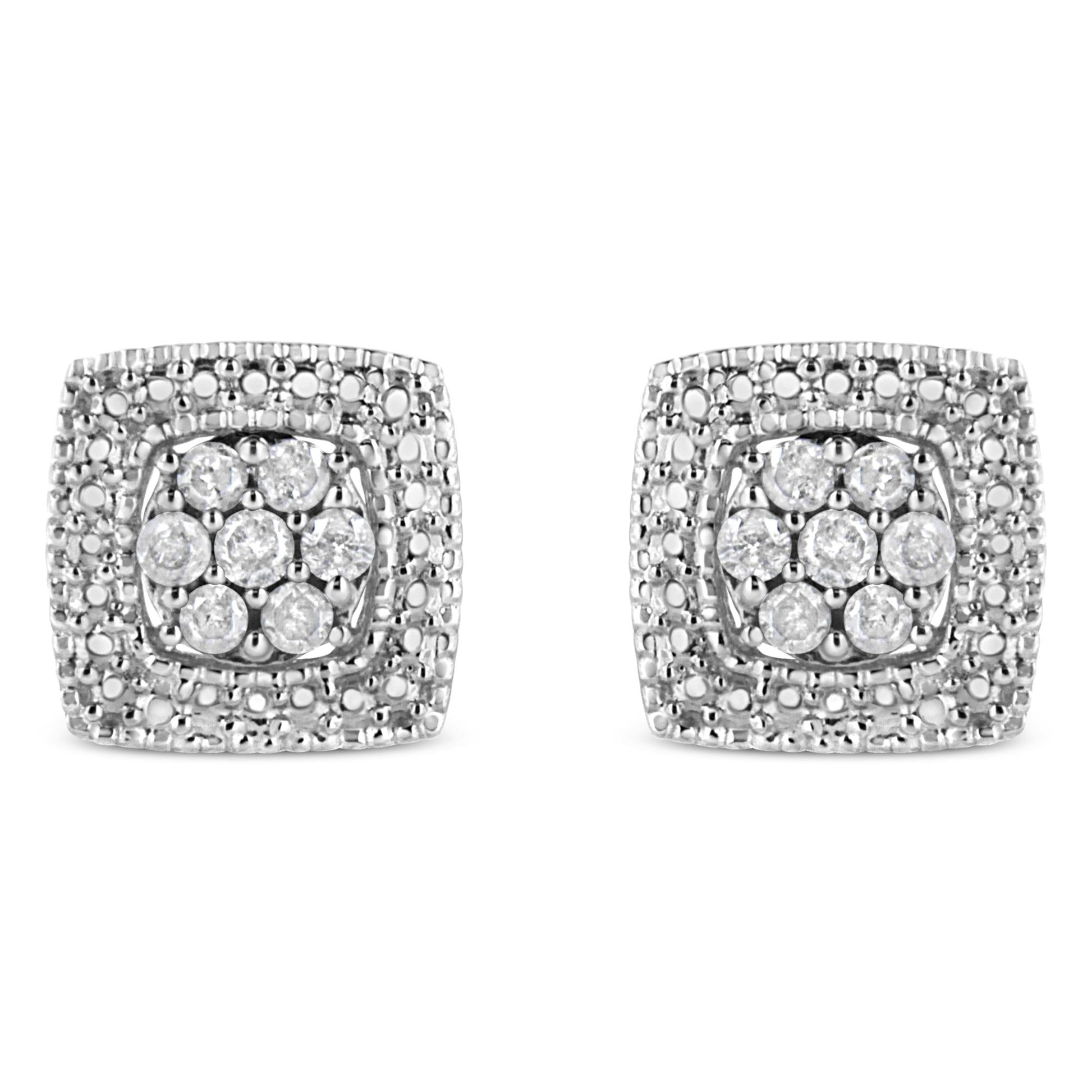 Treat yourself to these elaborate .925 sterling silver miligrain studs. The outer layer of these square earrings are set with silver beads that outline a center design set with 7 sparkling, round-cut diamonds. These gorgeous studs have a total diamond weight of 1/2 cttw and will dress up any outfit in your closet.