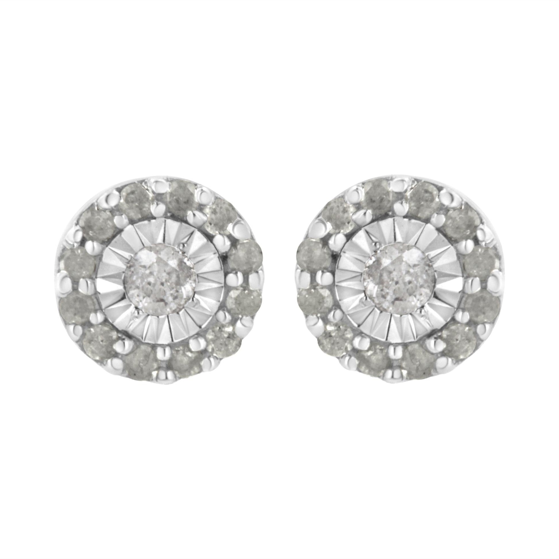 A glistening round cut diamond in a miracle setting sits at the heart of these sterling silver stud earrings. A halo of smaller round diamonds wraps around the central stone. 1/2ct TDW of diamonds shine in these earrings that secure with a push back mechanism.