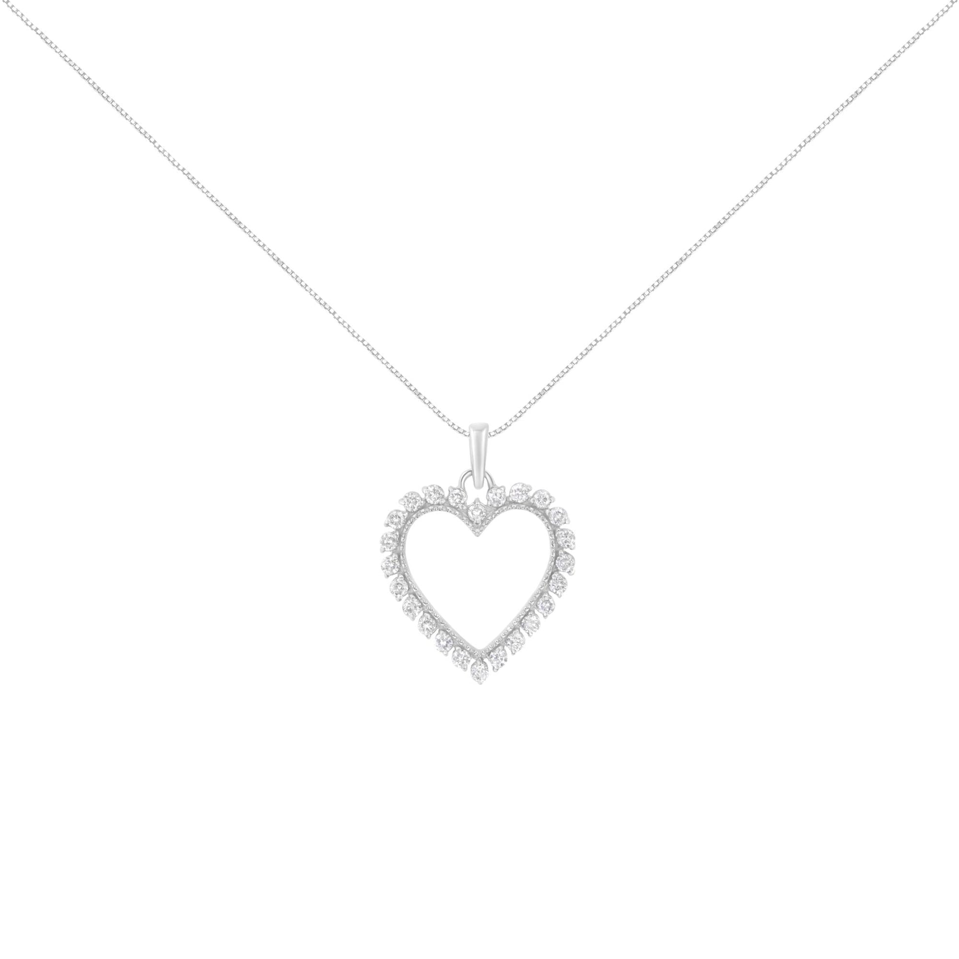 This open heart pendant is a shining symbol of love. Fashioned in cool sterling silver, this pendant showcases 1/2ct TDW of diamonds. 24 glistening round cut diamonds in prong setting sit along the outside edge of this heart design. The pendant dangles from a cable chain that secures with a spring ring clasp.