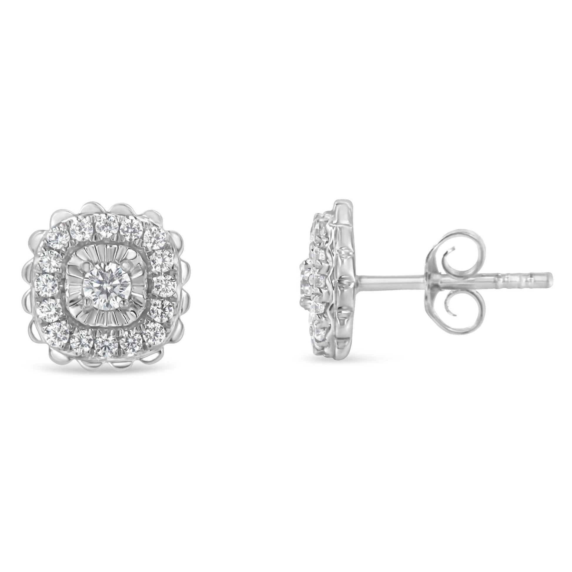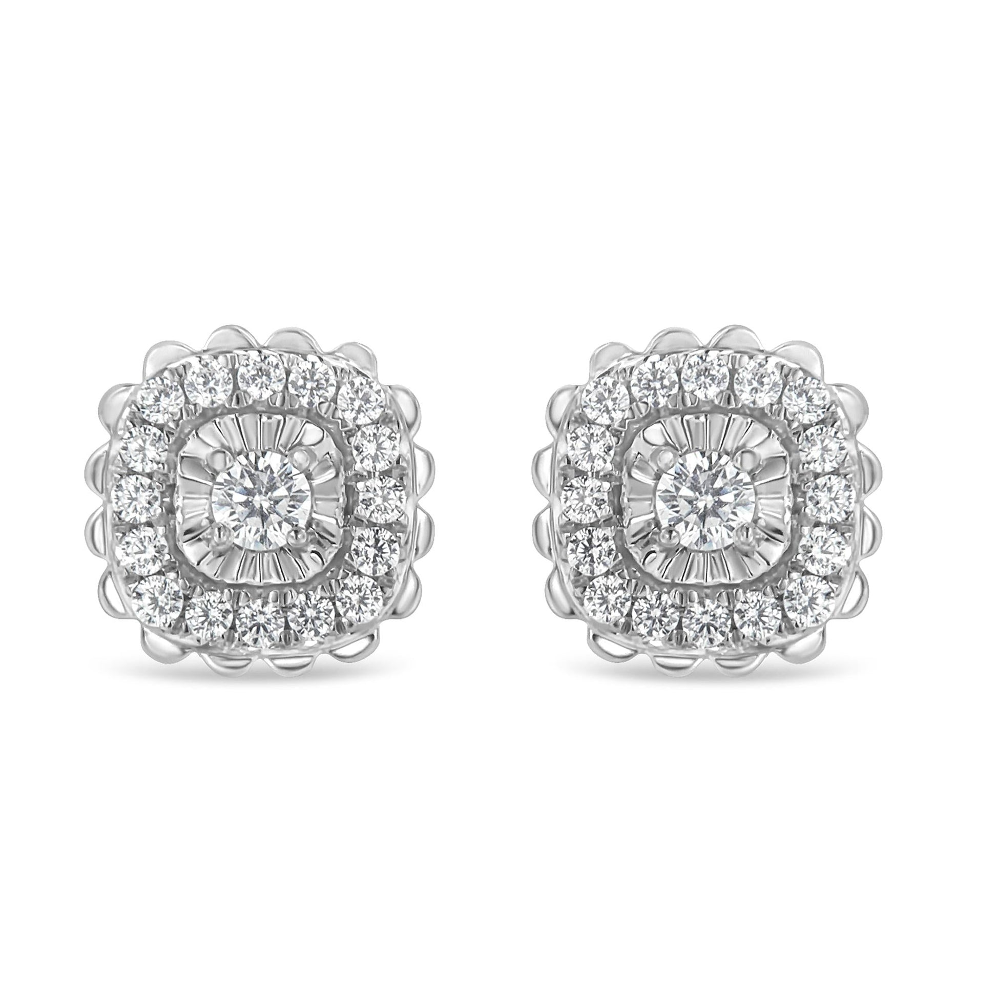 Treat yourself to these glamorous silver stud earrings with a twist on a classic floral design. A single miracle set, round-cut diamond sits at the center of this piece, flanked by a halo of smaller round-cut diamonds. This authentic design is crafted of real 92.5% sterling silver that has been electro-coated with genuine rhodium (a platinum-family metal), a precious metal that will keep a tarnish-free shine for years to come. These earrings have a total diamond weight of 1/2 cttw, and is the perfect accessory for any formal night out.