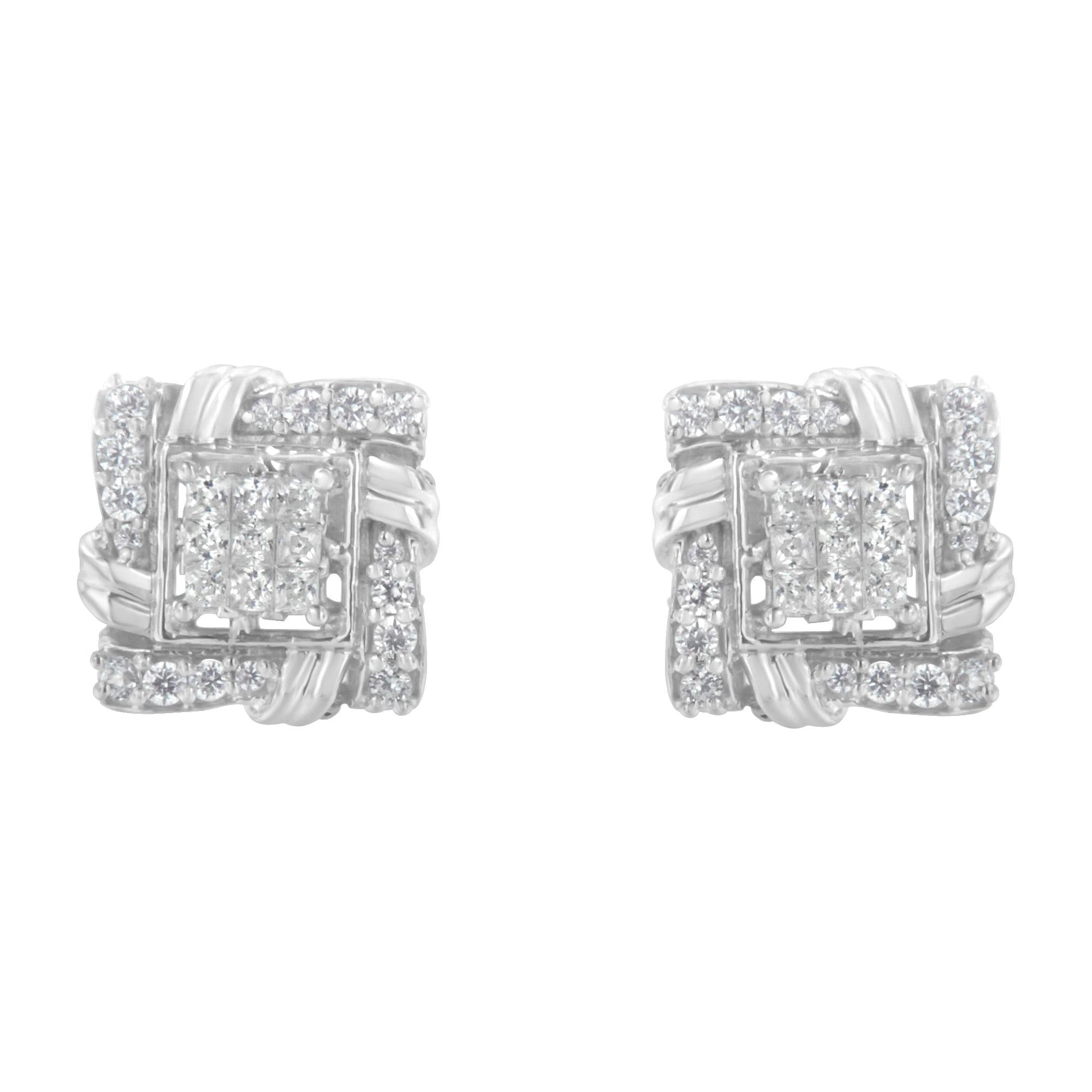 Discover the sheer elegance and timeless charm encapsulated in these sparkling stud earrings, expertly crafted from high-quality .925 sterling silver. At their heart lies a mesmerizing cluster of round-cut diamonds, totaling 1/2 carat, with each gemstone boasting a natural origin and shimmering with an I-J color and I1-I2 clarity. This lustrous core is ingeniously framed by a halo of intricately arranged smaller diamonds, creating a sophisticated woven texture that catches the light with every turn. The earrings' square silhouette enhances their contemporary appeal while maintaining an air of classic sophistication. Designed with push-back closures, they promise both comfort and security. Perfect for elevating everyday attire or adding a touch of glamour to evening wear, these earrings embody luxury and craftsmanship, making them an essential addition to any jewelry collection.