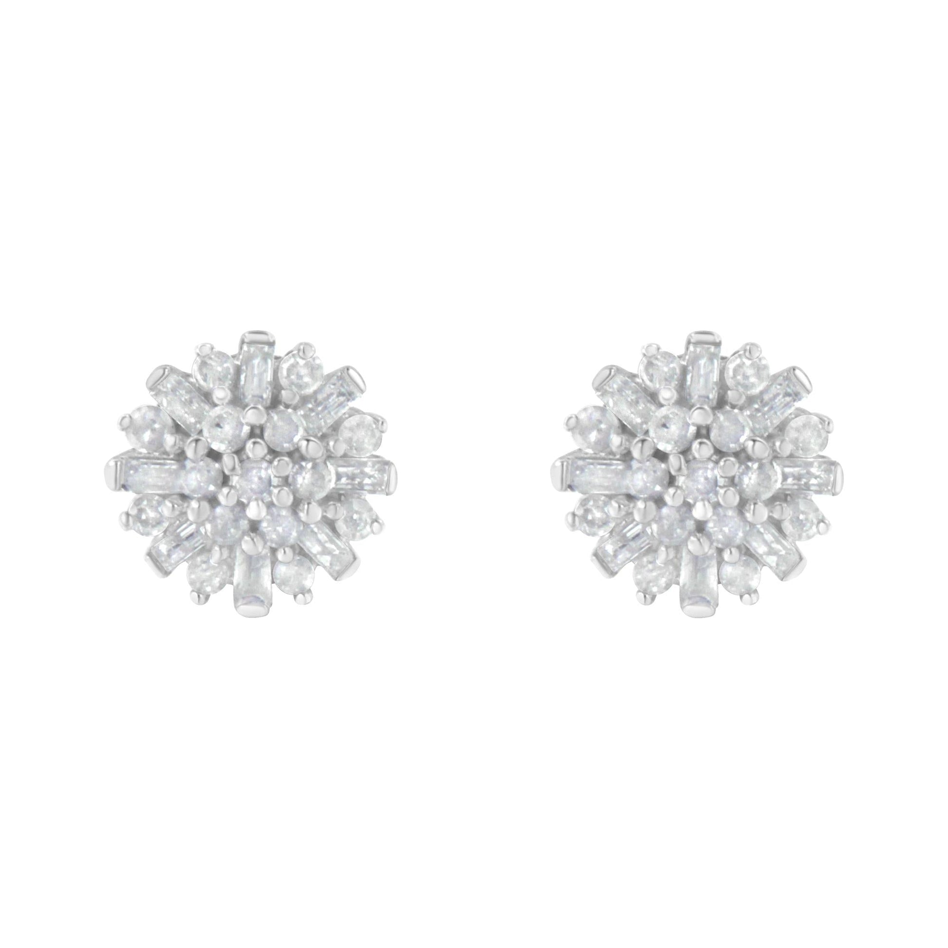 .925 Sterling Silver 1/2 Round and Baguette Diamond Sunburst Floral Cluster Stud Earrings (I-J Color, I3 Clarity)