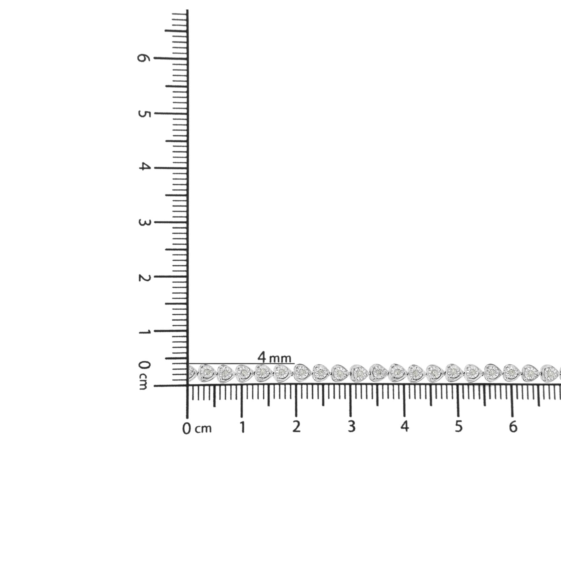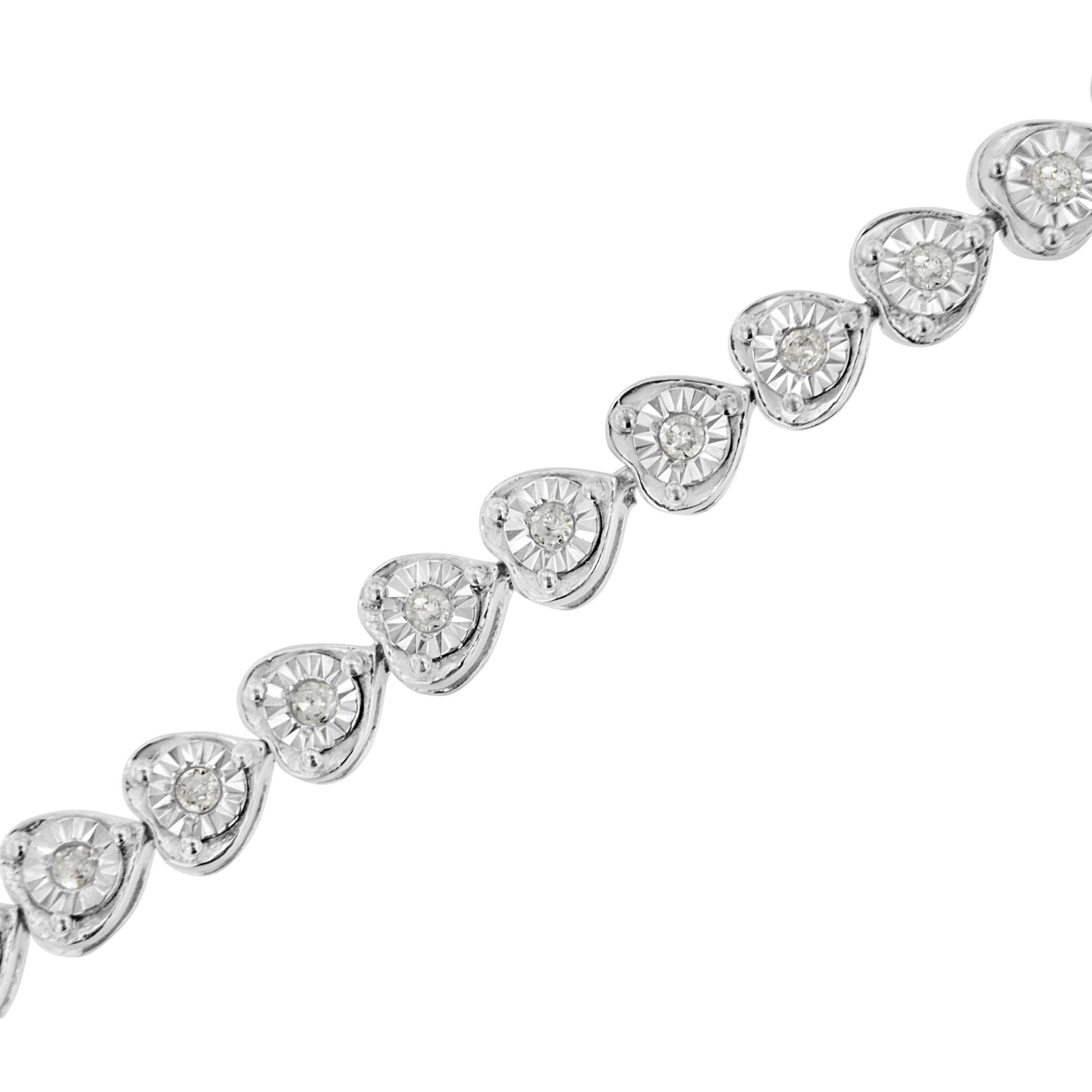 This silver link bracelet is as trendy and chic as they come. This authentic design is crafted of real 92.5% sterling silver that has been electro-coated with genuine rhodium (a platinum-family metal), a precious metal that will keep a tarnish-free shine for years to come. Heart links embellished with a round-cut diamond in a miracle setting make up the pattern of this bracelet, and will add a touch of glamour to any outfit of yours. This piece has a total carat weight of 1/3 cttw and will be a welcome addition to your jewelry collection.