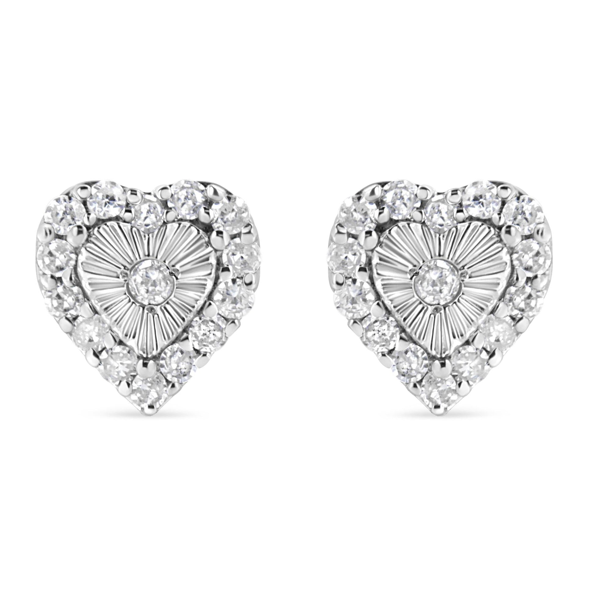 You will fall in love these dazzling sterling silver stud earrings. Each stud features 14 sparkling round cut diamonds set in a heart shaped halo. Inside the halo a miracle set round cut diamond adds extra sparkle to this beautiful and classic design. 1/3ct TDW of diamonds is showcased in these earrings that secure with a push back mechanism.