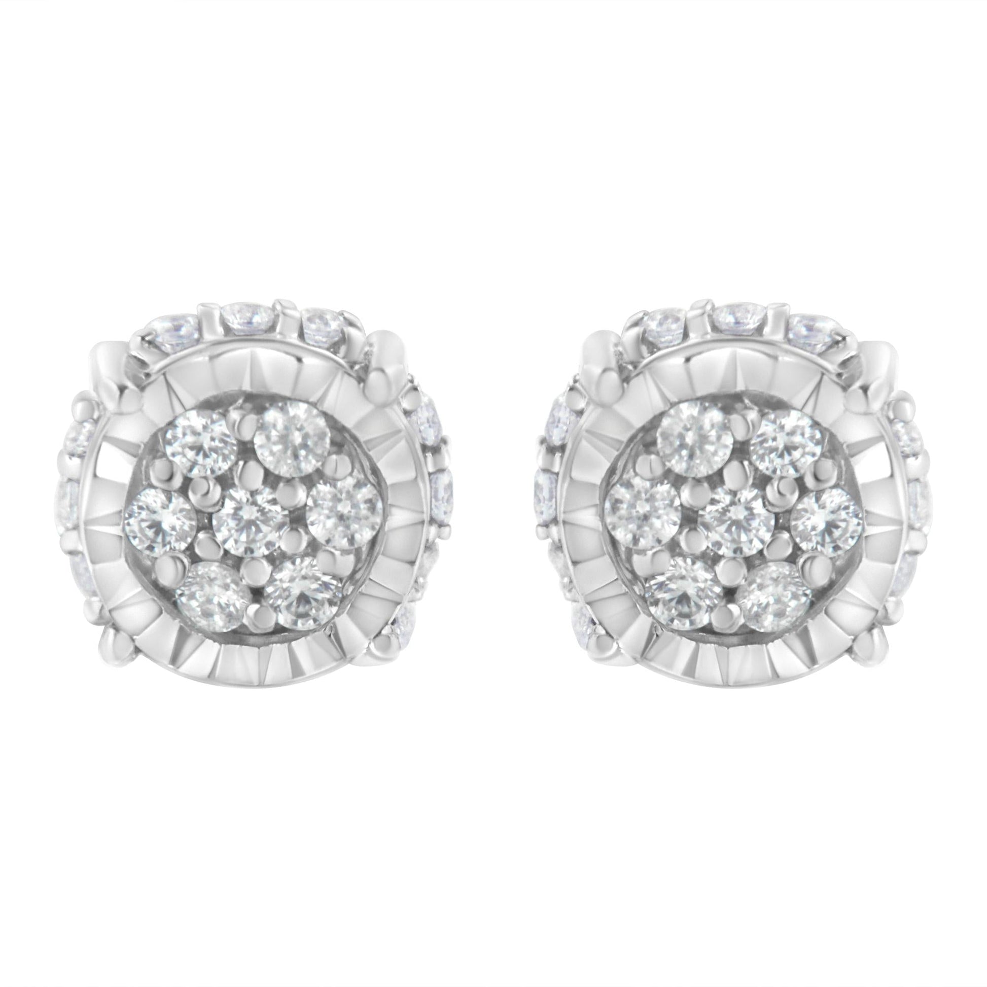 These delicate stud earrings have a unique design. Crafted in sterling silver, these earrings showcase 1/3ct TDW of promo quality diamonds. 7 round cut diamonds sit at the center of a circular stud. Surrounded by a silver halo. Shimmering on the sides of the design additional round diamonds adorn the studs. A push back mechanism keeps the earring secure and you worry free. Promo quality diamonds are on the lowest of diamond color and quality scale. Round-cut, promo quality diamonds are milky and cloudy in nature. They have asymmetrical ball shape and are filled with inclusions.