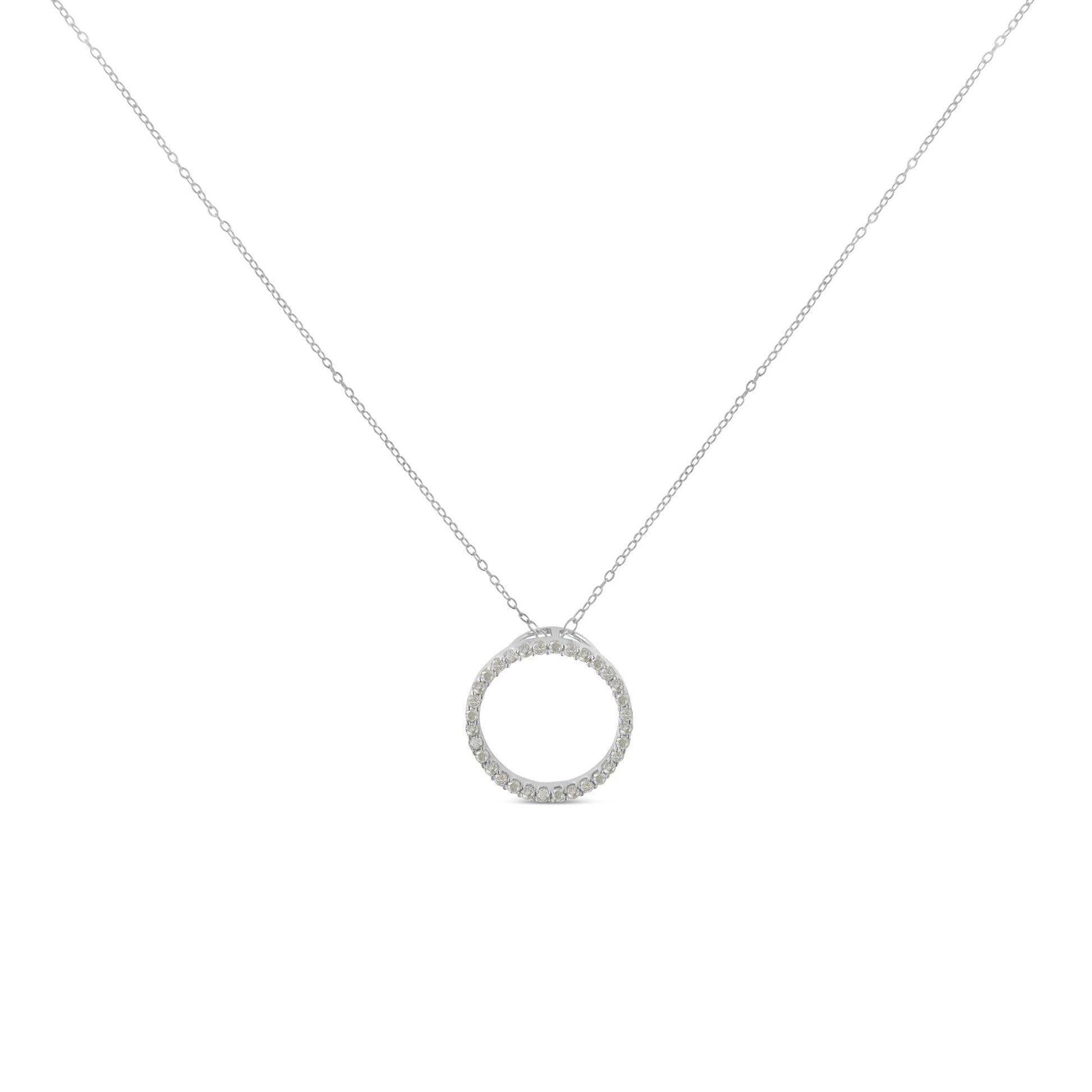 This spectacular circular pendant necklace is hand-crafted of the finest .925 sterling silver and stunning genuine diamonds. This pendant necklace uses a classic shared-prong design to highlight an open loop of round-cut diamonds. Available in graduated sizes from 13mm (1/2", with 1/4 carat of diamonds in all), to 22mm (7/8", with 3/4 carat of diamonds in all), all on an 18" rolo chain. Wear one alone, or choose two or three for a multi-layered effect. This simple and clean silhouette adds incredible sparkle for formal events and everyday wear alike.