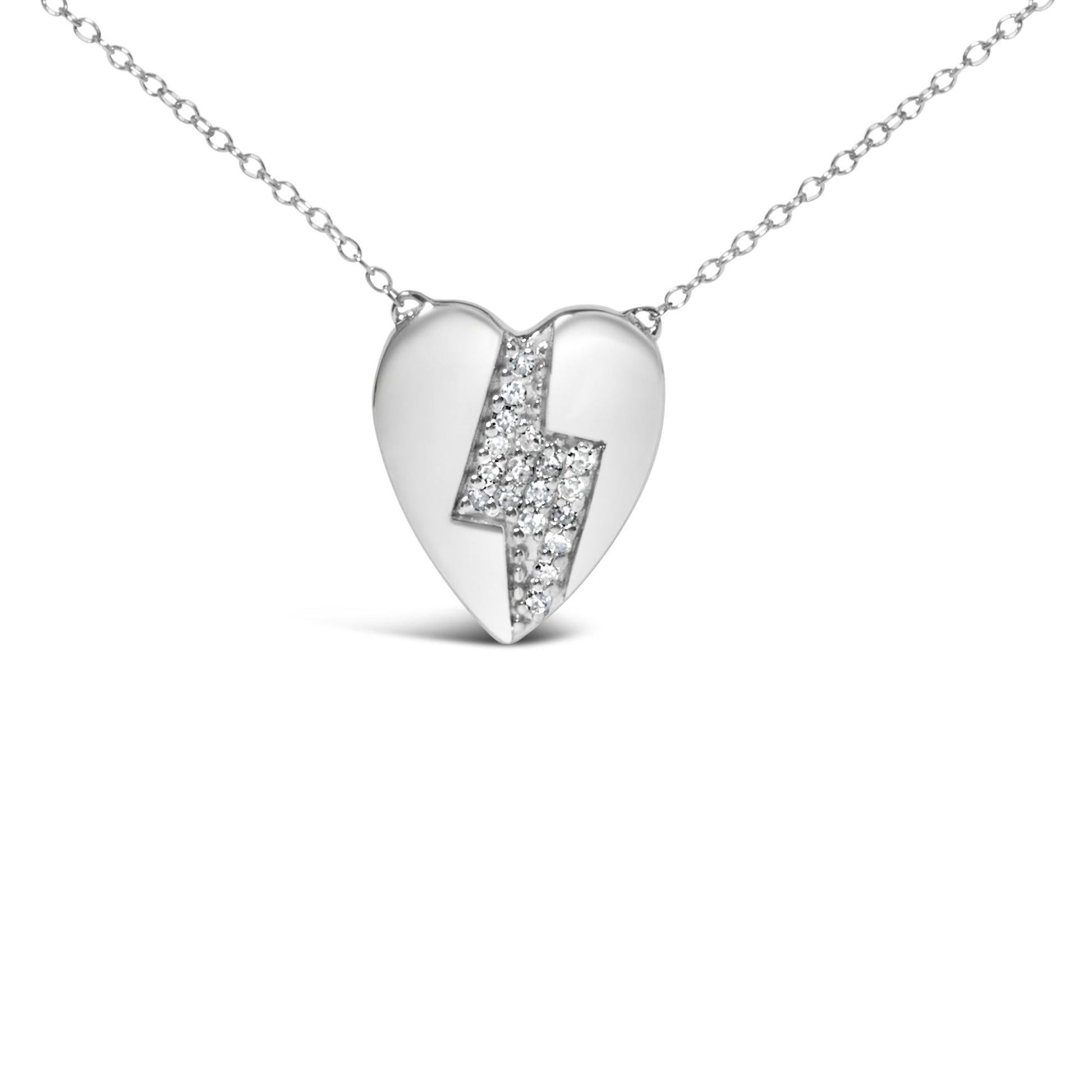 Ignite a spark of elegance and audacious charm with this exquisite pendant necklace, meticulously crafted from rhodium-plated 925 sterling silver. Designed to capture hearts, it merges the romantic allure of a classic heart silhouette with the dynamic energy of a lightning bolt, each crevice intricately studded with natural, earth-mined diamonds boasting H-I color and SI1-SI2 clarity. This striking juxtaposition not only embodies a balance of power and tenderness but also ensures that the piece glistens with an unrivaled brilliance under any light. Dangling delicately from an 18-inch cable chain secured with a spring ring clasp, this necklace promises both comfort and style, making it a perfect adornment for everyday wear or a glamorous night out. Elevate your jewelry collection with this symbol of love electrified by unstoppable force, a true testament to sophisticated craftsmanship and timeless design.