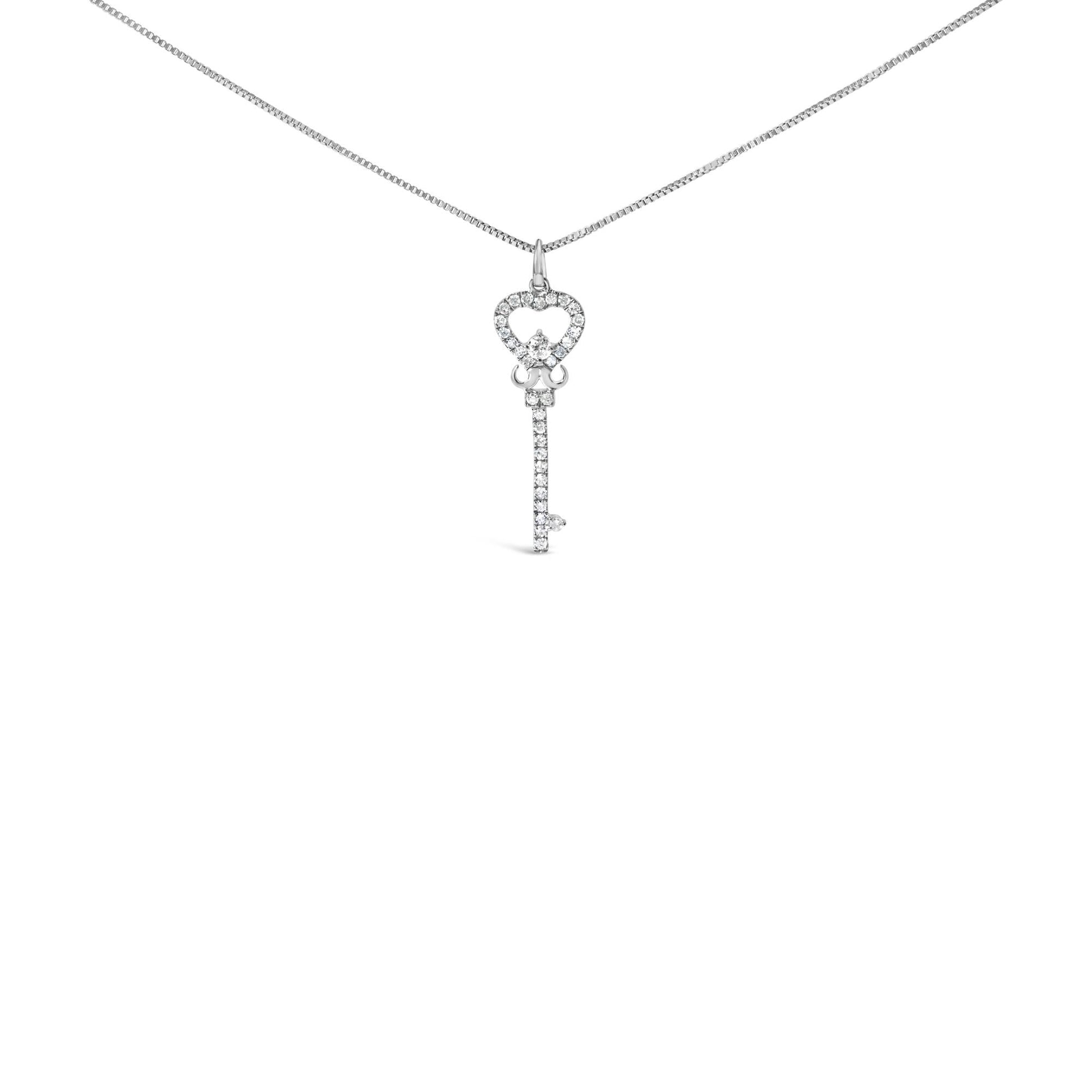 Unlock the treasure of timeless elegance with this exquisite .925 sterling silver pendant necklace, where each element articulates sophistication and exclusivity. Crafted with precision, the key-shaped charm is rhodium plated, radiating a mirror-like shine that captures the soul of luxury. Delicately studded with 1/3 carat of natural, earth-mined diamonds, this piece glistens with every turn, reflecting its pristine H-I color and I2-I3 clarity. These gems are not only embedded with skill but are designed to shimmer spectacularly under any light, making moments unforgettable. Suspended on an 18-inch cable chain that rests perfectly around the neck, it is secured with a spring ring clasp that promises safety with sleekness.