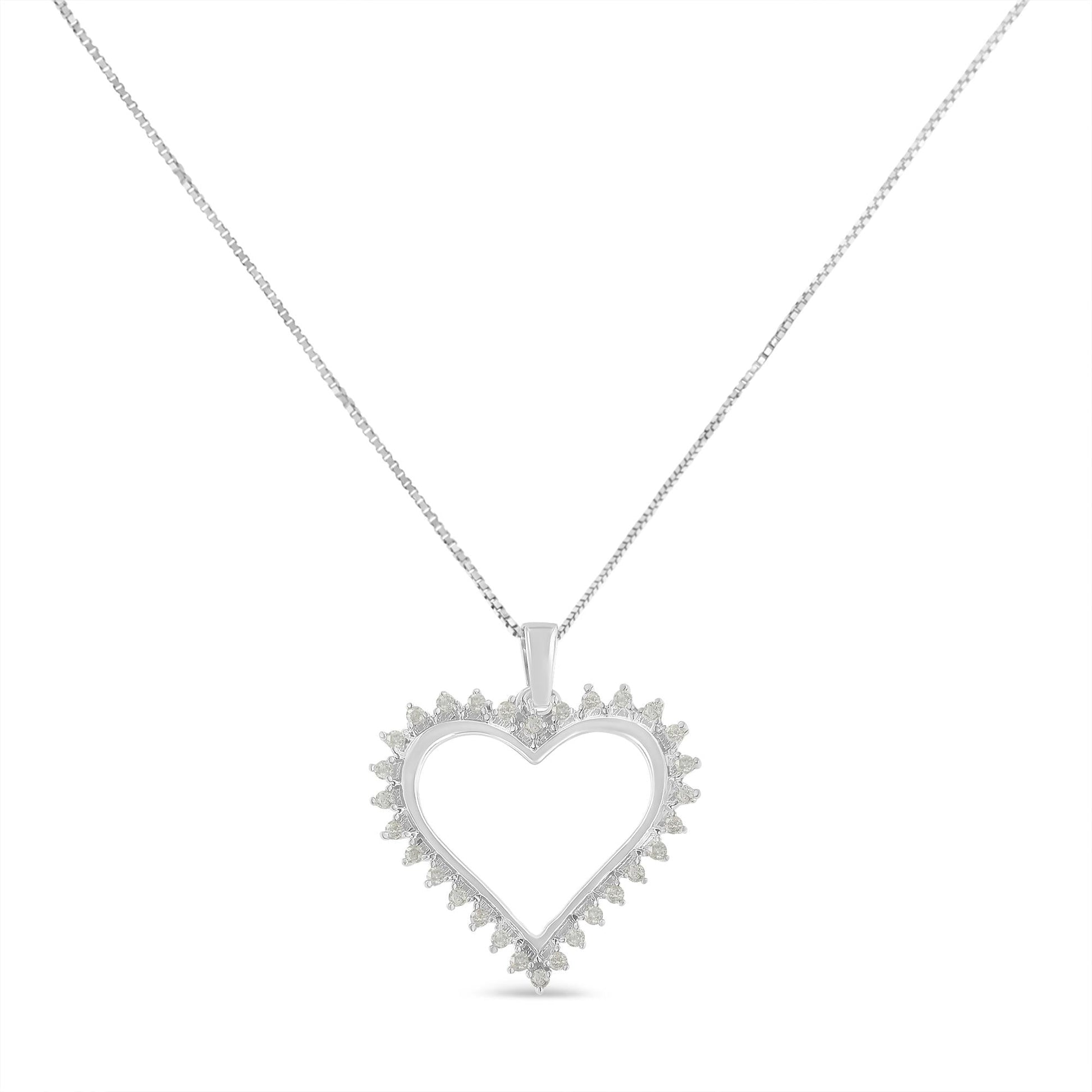 A shimmering halo of prong set, round cut diamonds sit around a lovely open heart pendant. 1/4ct TDW of diamonds sparkle in this sterling silver design. The pendant hangs from a box chain that secures with a spring ring clasp.
