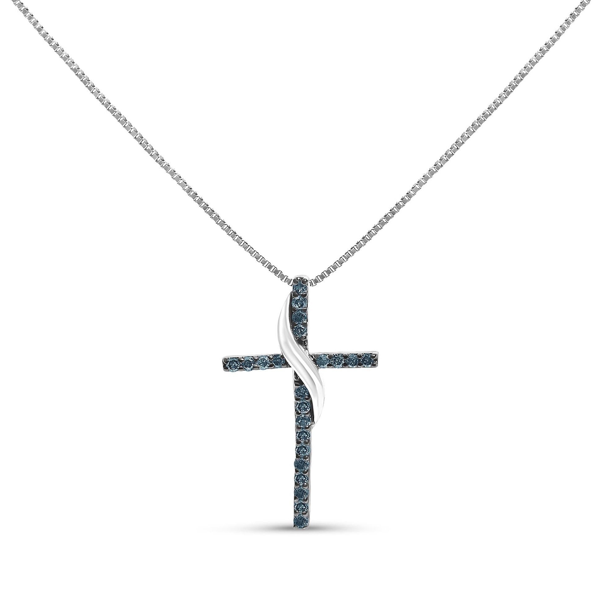 .925 Sterling Silver 1/4 Cttw Blue Diamond Ribbon Swirl over Cross Pendant Necklace (Blue Color, I2-I3 Clarity) - 18" Inches