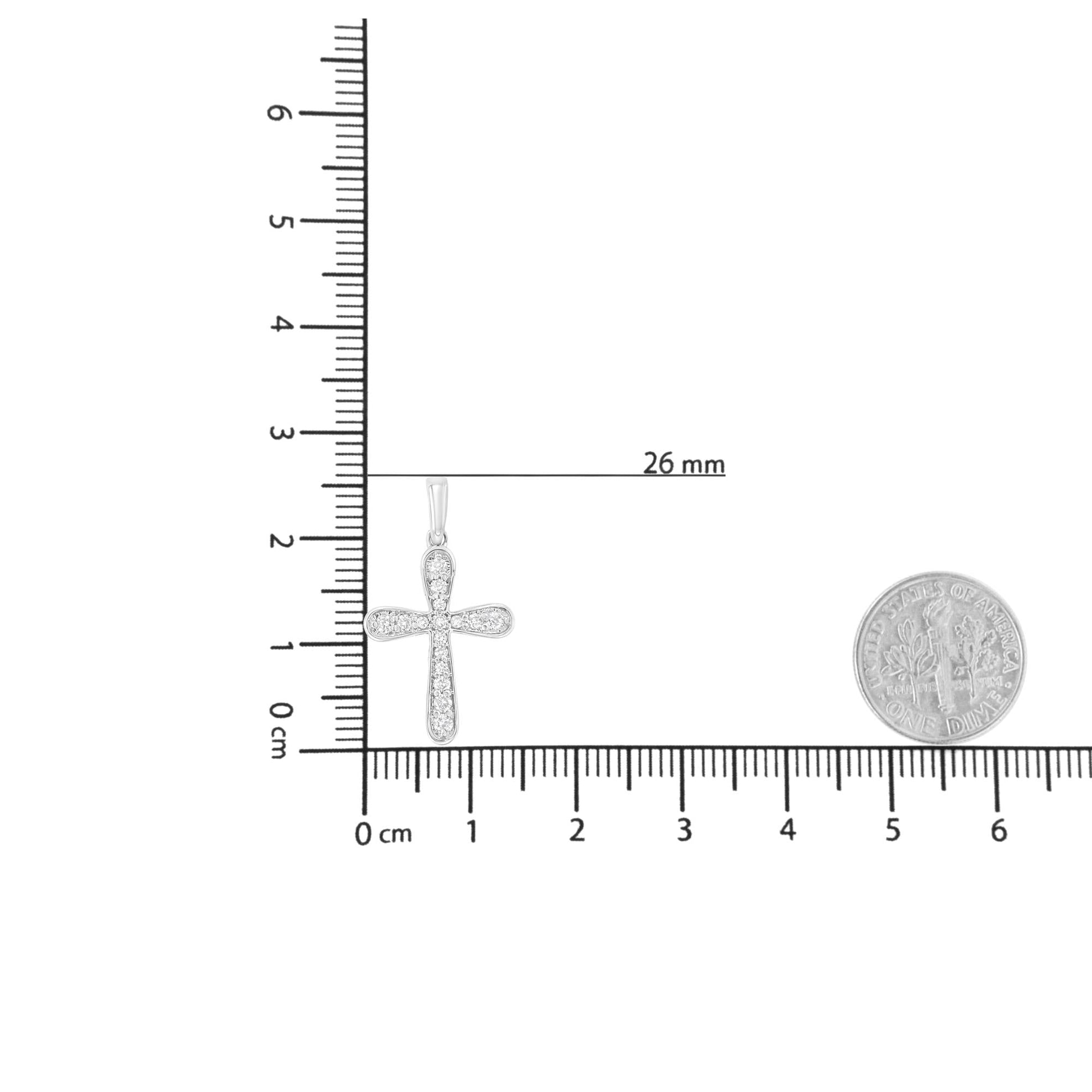 This simple yet luxurious 1/4 ct tdw diamond cross pendant is a testament to your everlasting fashion sense. Meticulously crafted, this necklace is fashioned from .925 sterling silver and is embellished with 11 round cut diamonds of varying sizes in a prong setting. This dazzling cross pendant dangles from the matching 18" cable chain.
