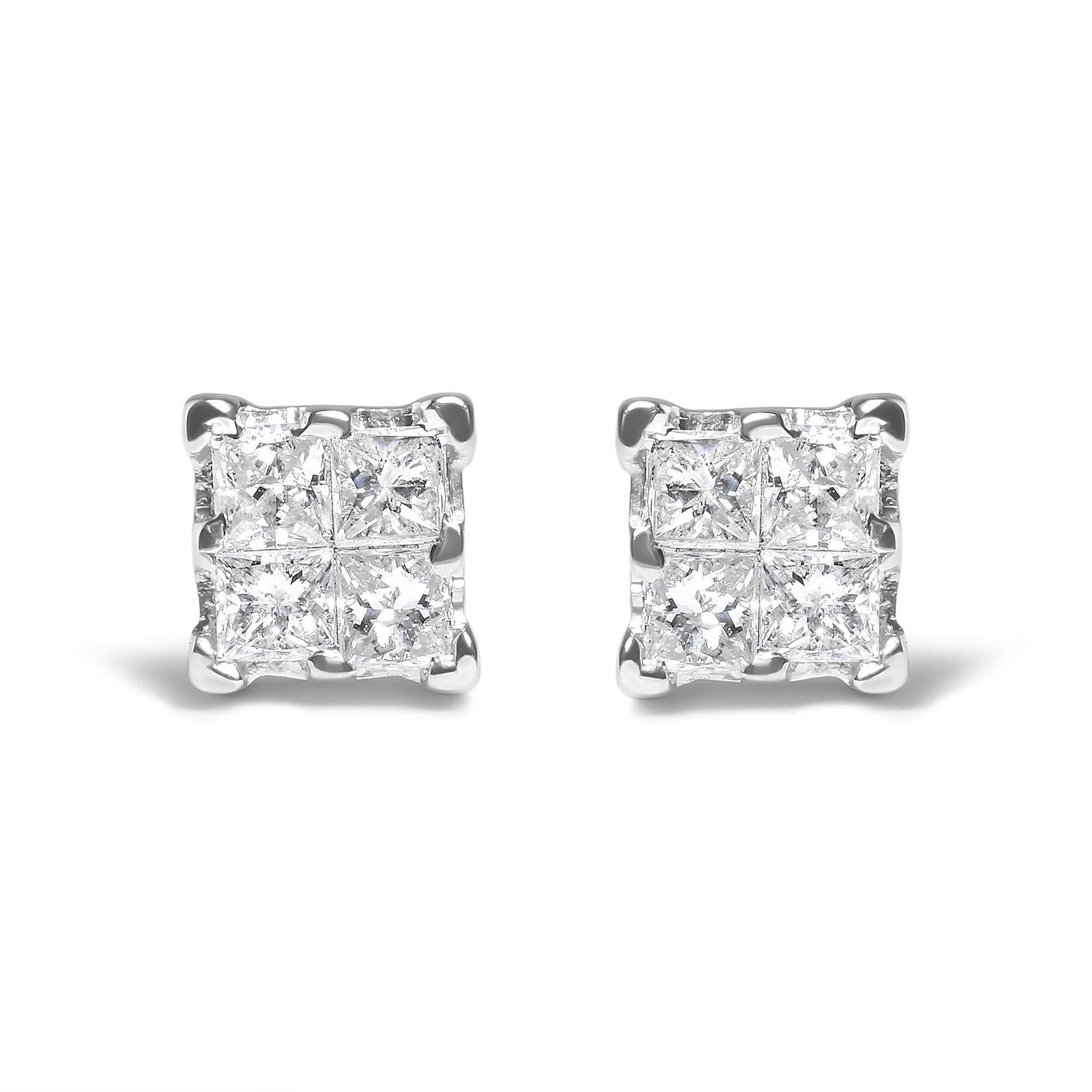 These composite designed earrings feature stunning, invisibly-set diamonds that enhance the size of the diamonds for a larger overall diamond look. Revealing a quad of four princess cut diamonds on each stud, these earrings are perfect for everyday wearing in .925 sterling silver with push back findings for easy wearing. The diamonds have an approximate I-J color and are I1-I2 clarity.