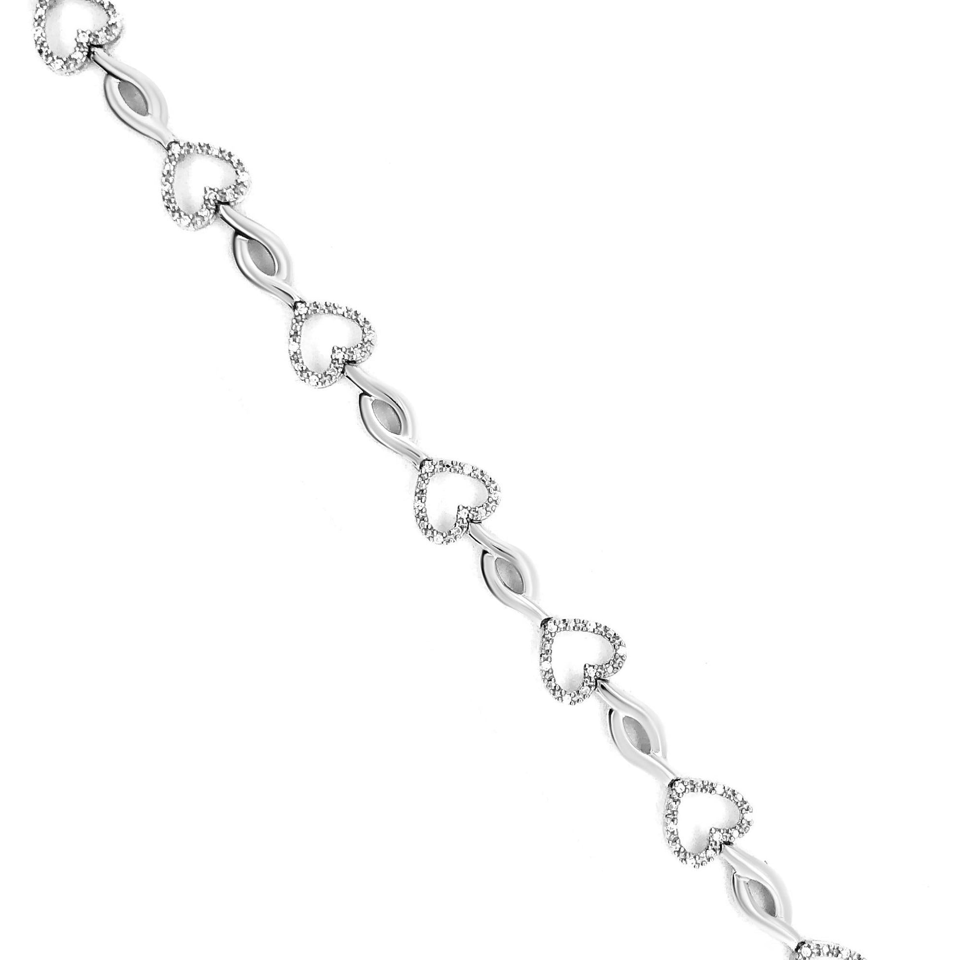 Shine bright this season with this trendy silver bracelet with elegant heart and infinity links. This piece is crafted in the finest .925 sterling silver, plated with rhodium (a platinum-family metal) for a lifetime of tarnish-free wear. The bracelet sparkles with 1/4 cttw of natural, round-cut diamonds in an elegant prong setting. This piece will stand out on your wrist and is the perfect pop of bling to add to any outfit.