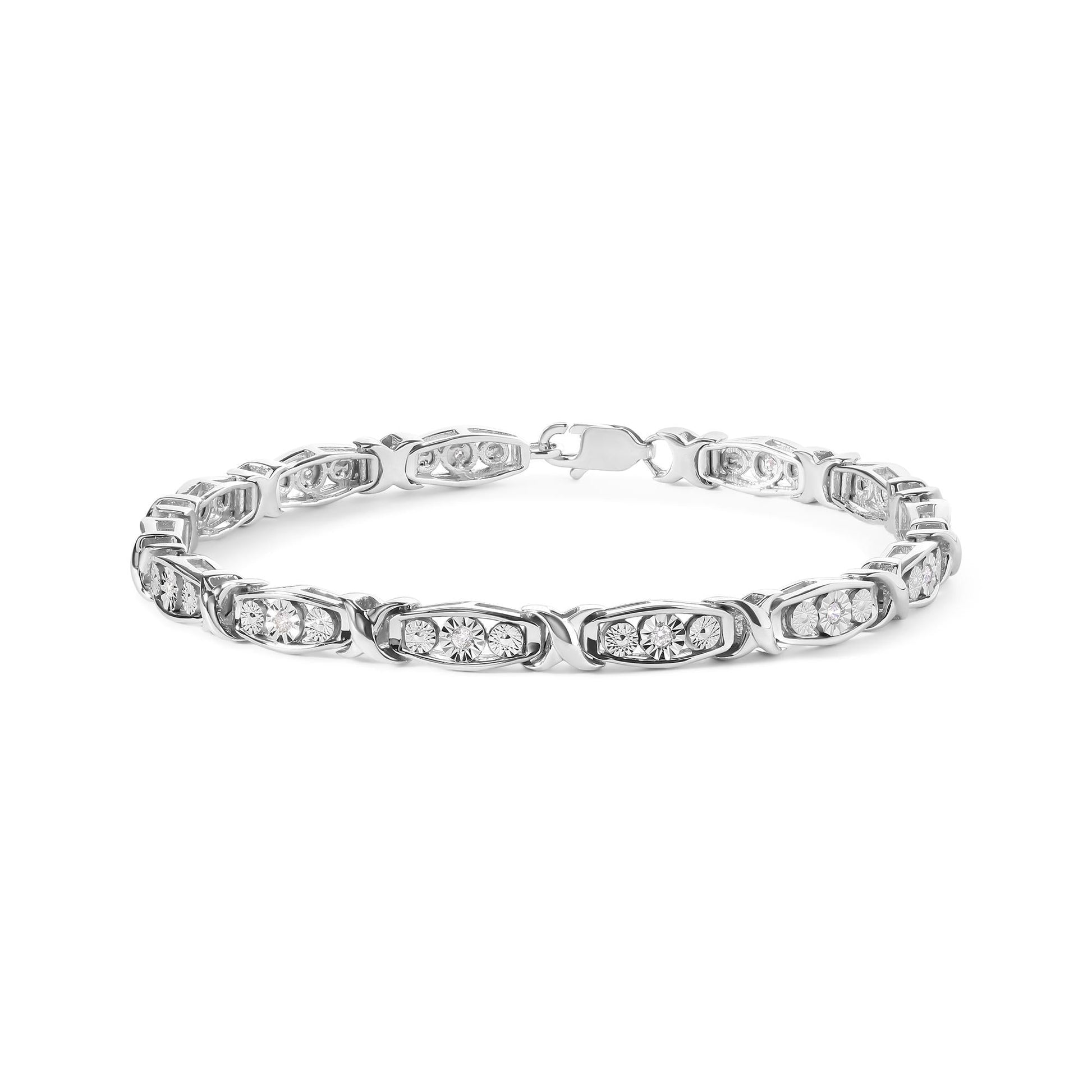 Indulge in the timeless elegance of this stunning .925 sterling silver link bracelet, adorned with 15 natural round diamonds totaling 1/4 cttw. The miracle setting enhances the sparkle of the I-J color diamonds, while the I2-I3 clarity ensures a brilliant shine. With a box clasp for added security, this 7.50" bracelet is perfect for any occasion. Whether you're dressing up for a night out or adding a touch of glamour to your everyday look, this exquisite bracelet is a must-have for any woman's jewelry collection.