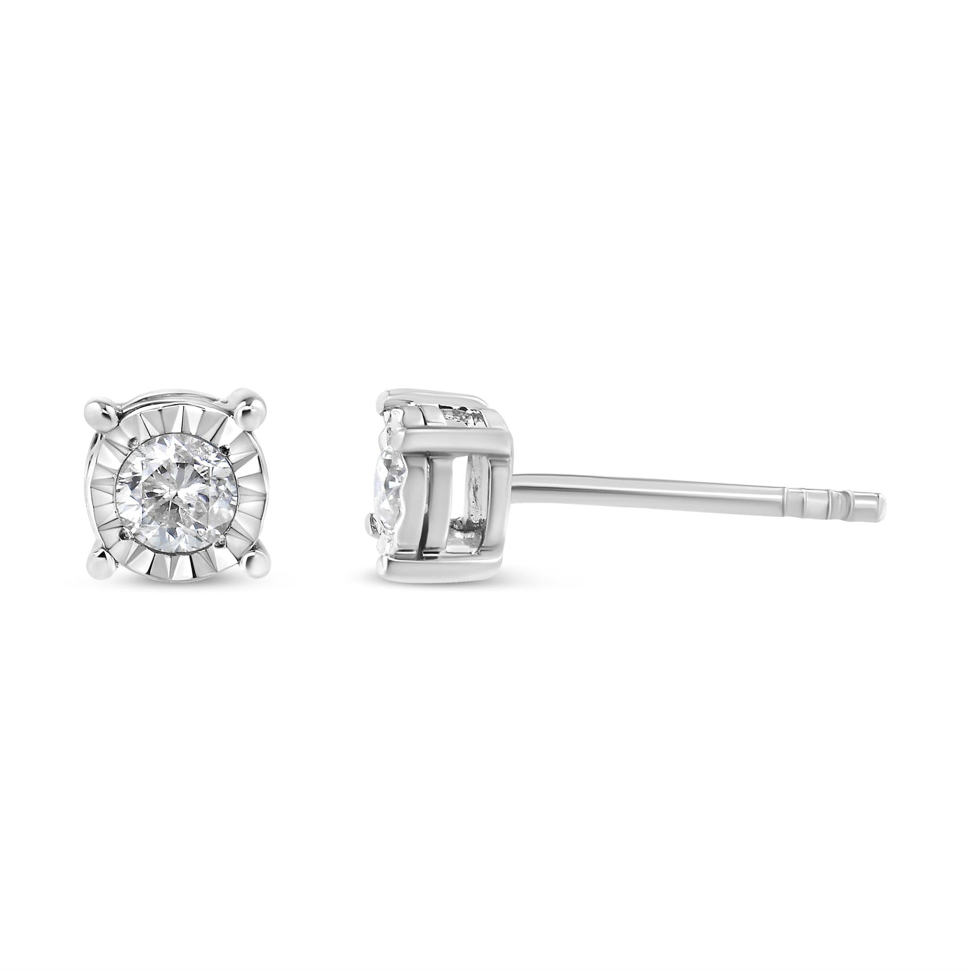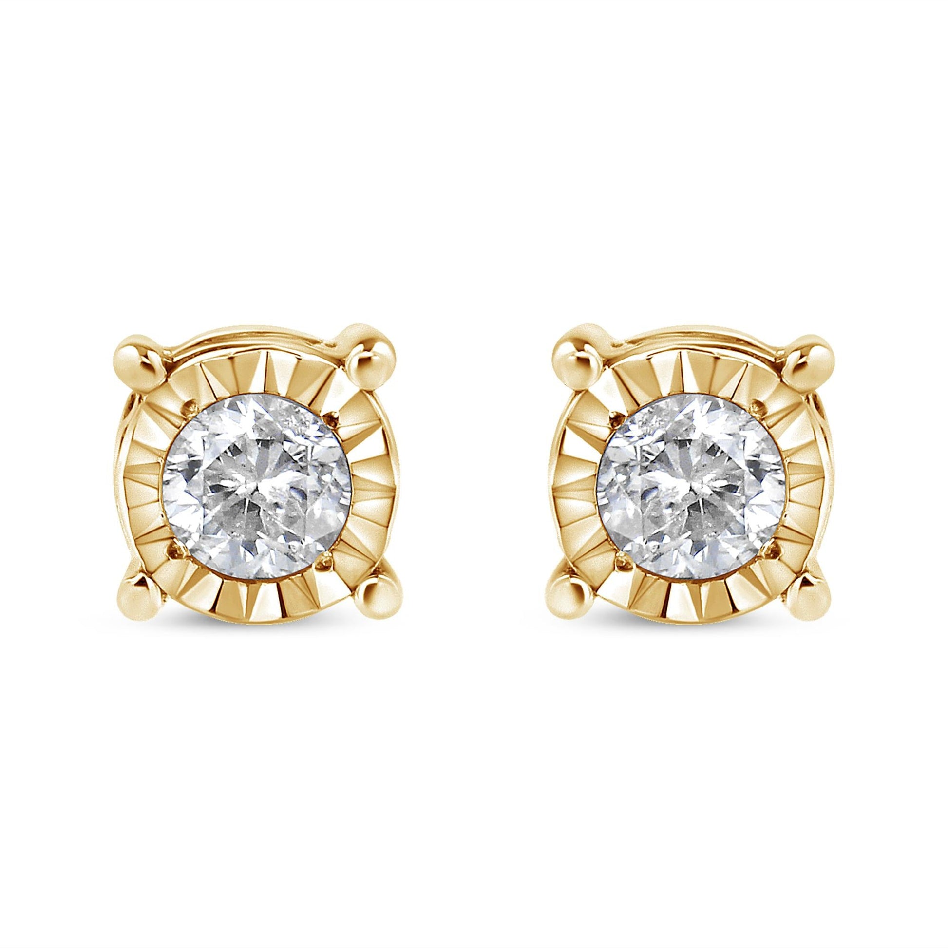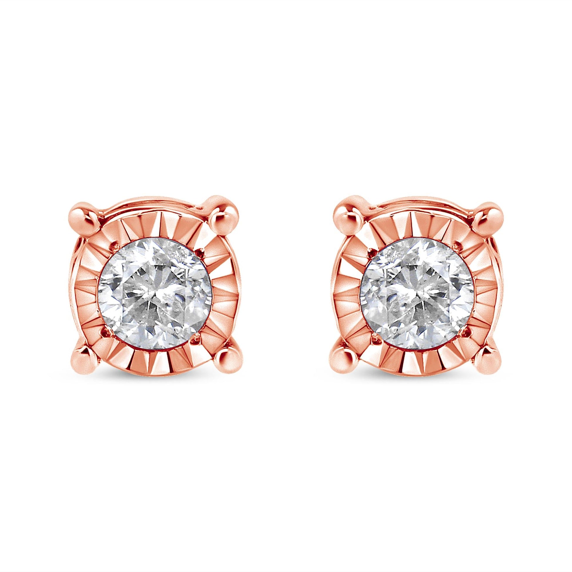 Add a shimmering touch to your wardrobe with these elegant and extravagant diamond earrings. Fashioned in the round shape, the earrings are crafted of your choice of sterling silver flashed with white rhodium, or with 10K rose or yellow gold electroplating. Each of the studs captivates with a miracle plated fluted frame setting, which gives the illusion of a larger diamond and makes them shine like countless stars glitter in the sky. Butterfly push-backs on friction notched posts ensure carefree all-day wear.