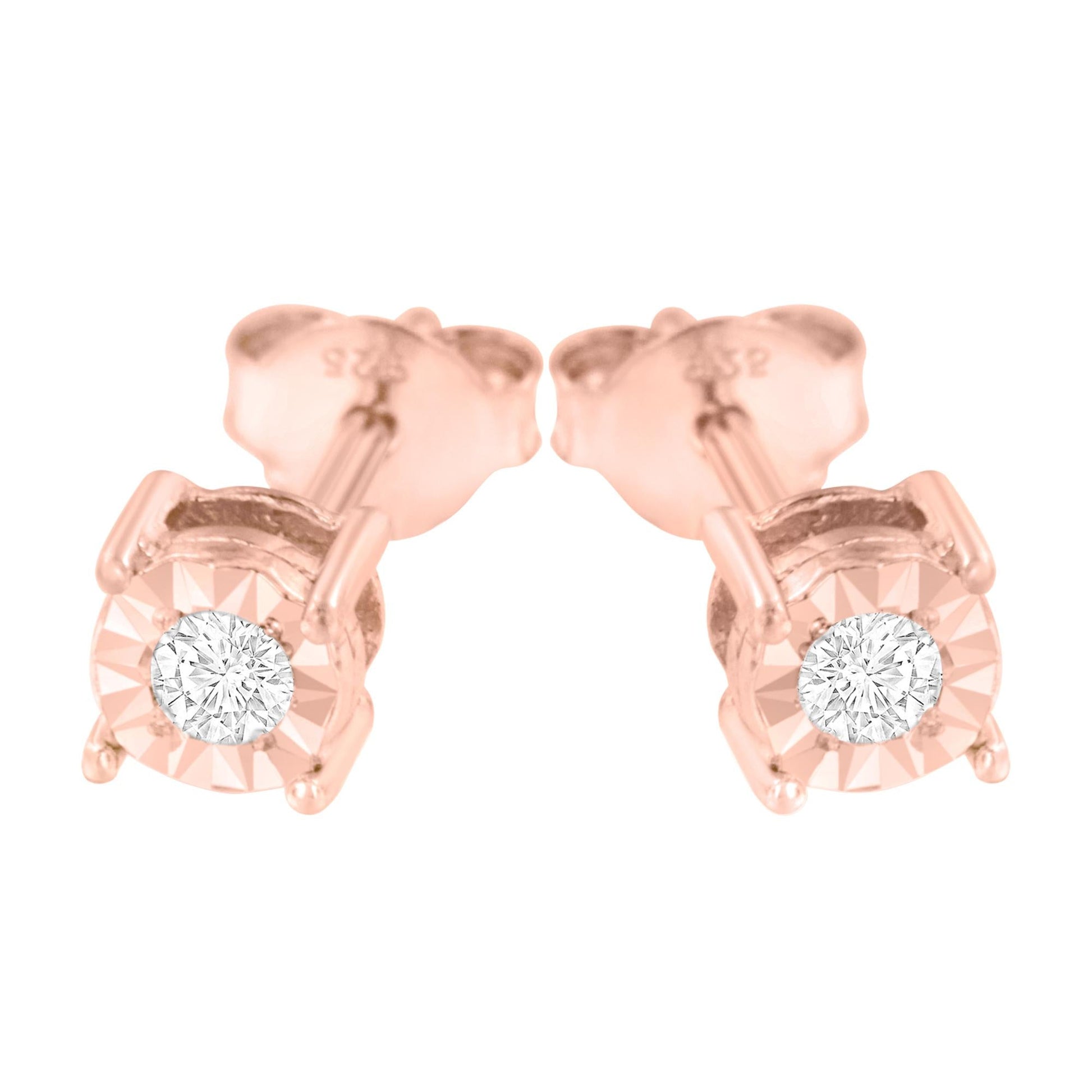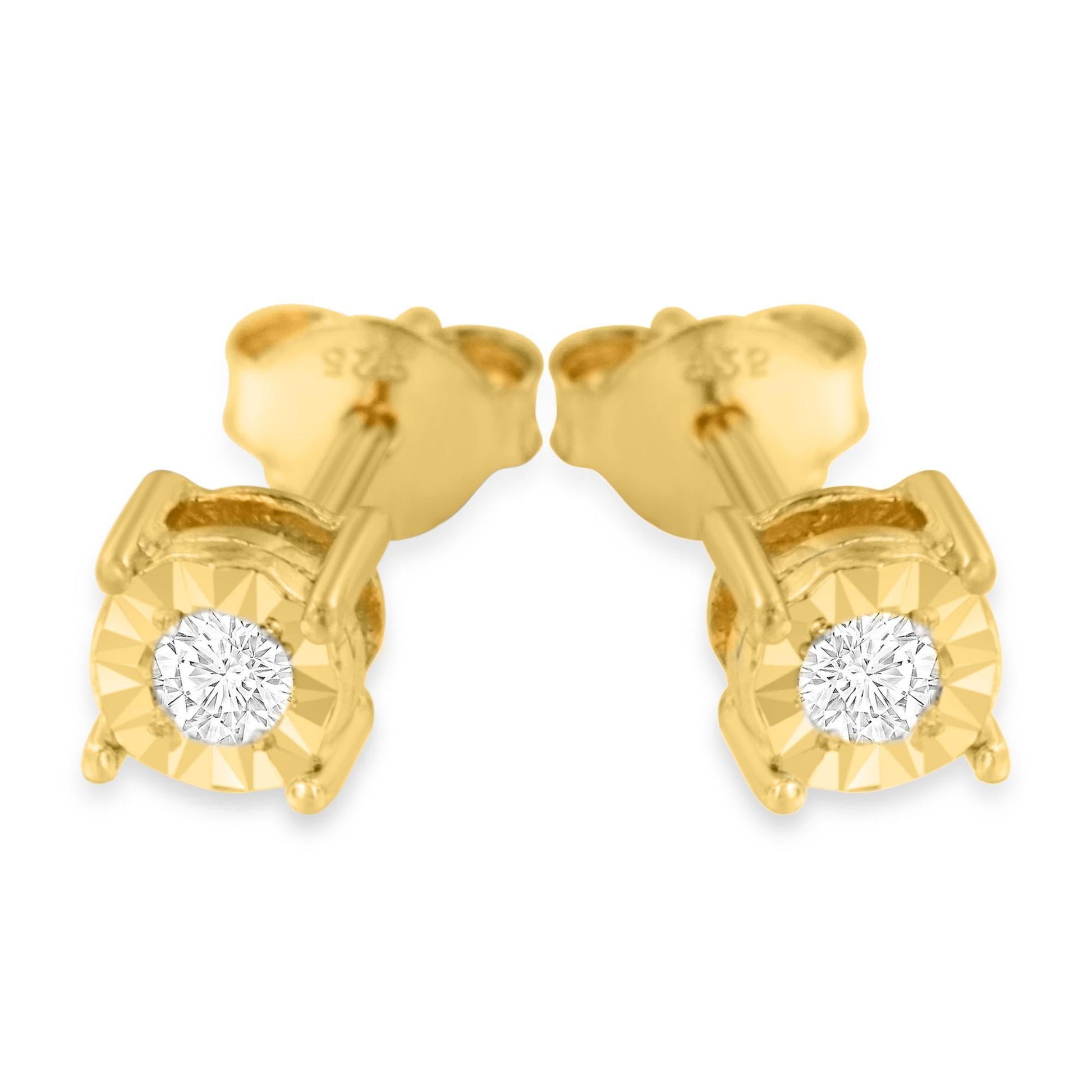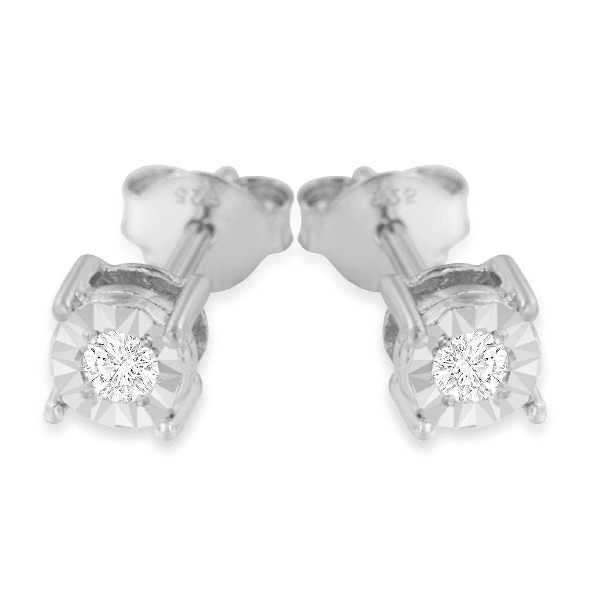 Add a shimmering touch to your wardrobe with these elegant and extravagant diamond earrings. Fashioned in the round shape, the earrings are crafted of your choice of sterling silver flashed with white rhodium, or with 10K rose or yellow gold electroplating. Each of the studs captivates with a miracle plated fluted frame setting, which gives the illusion of a larger diamond and makes them shine like countless stars glitter in the sky. Butterfly push-backs on friction notched posts ensure carefree all-day wear.