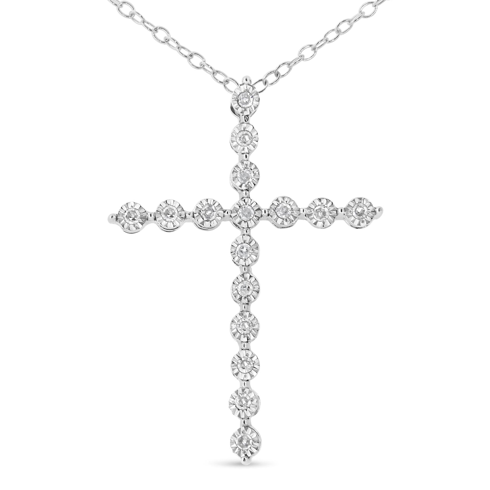 A brilliant beacon of faith and hope, our stunning Sterling Silver Diamond Cross Pendant Necklace has been designed to be a dazzling reminder of optimism and confidence to anyone who wears it. Crafted from fine grade .925 sterling silver for its size 18 polished chain necklace, this beautiful neck jewelry showcases a meticulously made design symbolizing faith eternal. Featuring a diamond encrusted cross pendant with 18 natural, sparkling diamonds, this diamond necklace will easily lend an understated elegance to a Sunday mass outfit or any type of casual attire.