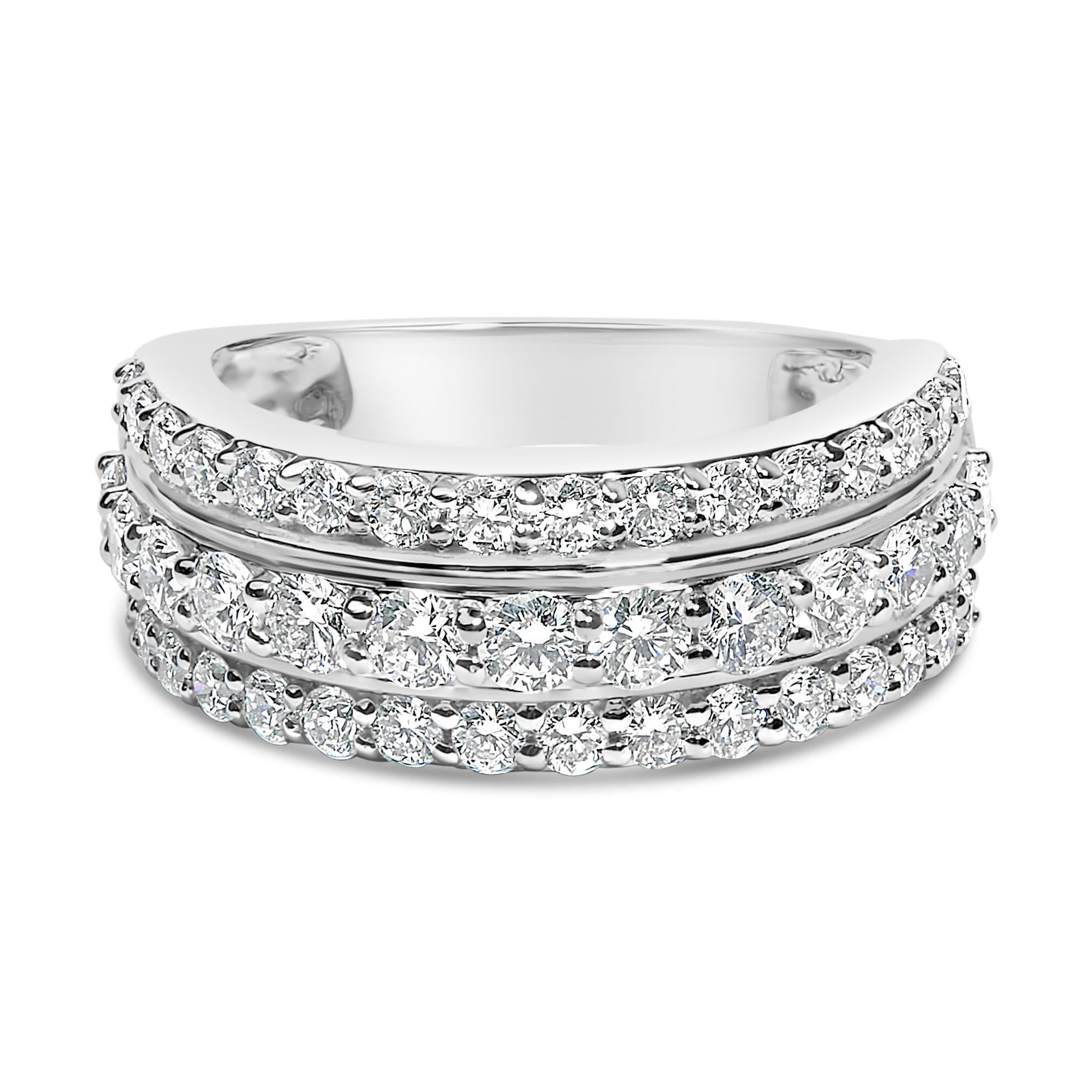 Embrace the sparkle and modern elegance of this exquisite .925 sterling silver ring, plated with lustrous rhodium for enduring shine. The piece features a triumphant trio of rows, each adorned with dazzling lab-grown diamonds, totaling a resplendent 2.0 carats. Each diamond is meticulously prong set, engineered to catch the light and cast a breathtaking brilliance. The interplay of light and geometry is enhanced by the expertly raised lines of silver that flank the central diamond display, adding both depth and sculptural finesse. The interiors smooth polish ensures this ring isn’t just a delight to behold but a pleasure to wear. Perfectly suited for the eco-conscious and style-savvy, this ring melds contemporary luxury with ethical sensibility, making it a stunning choice for any occasion.