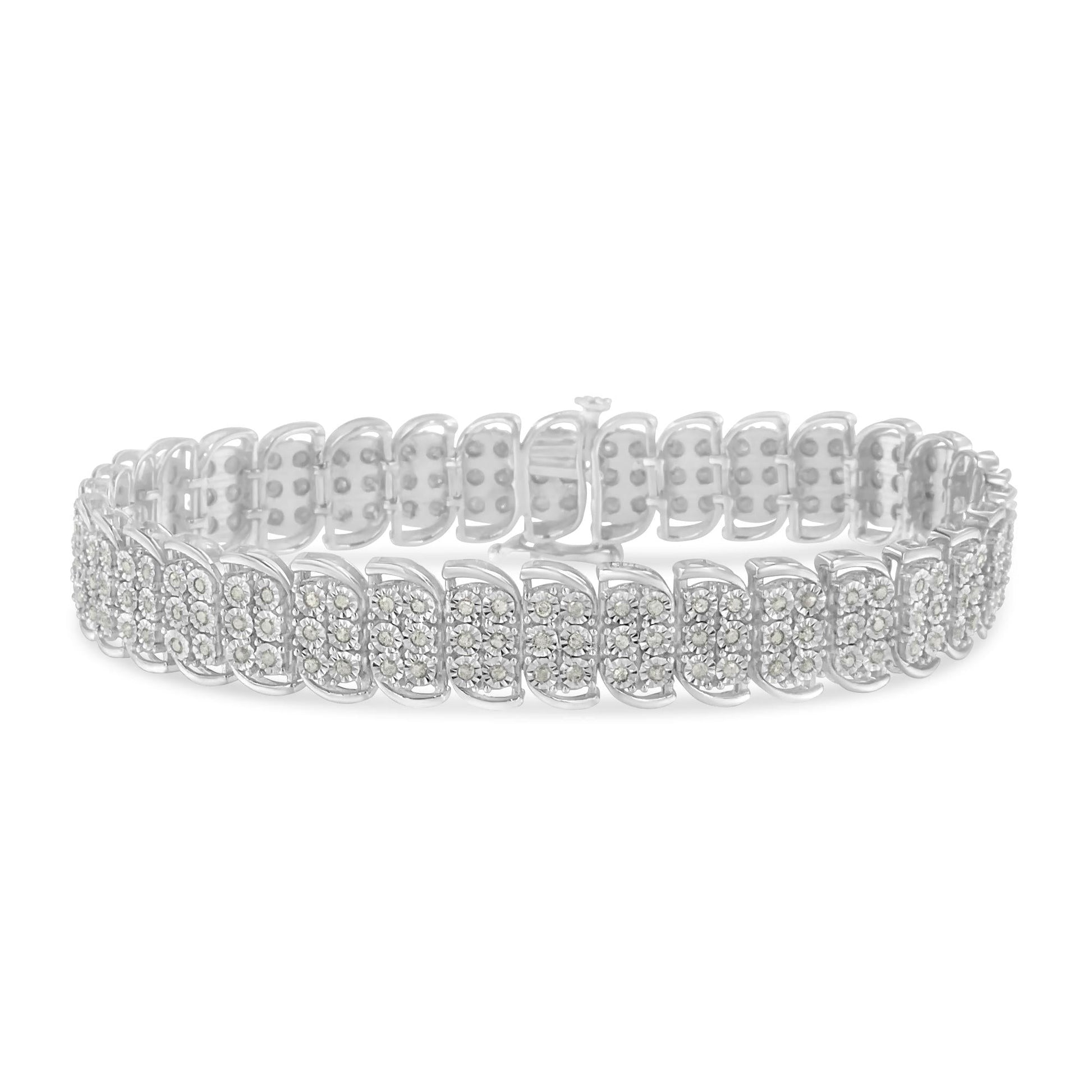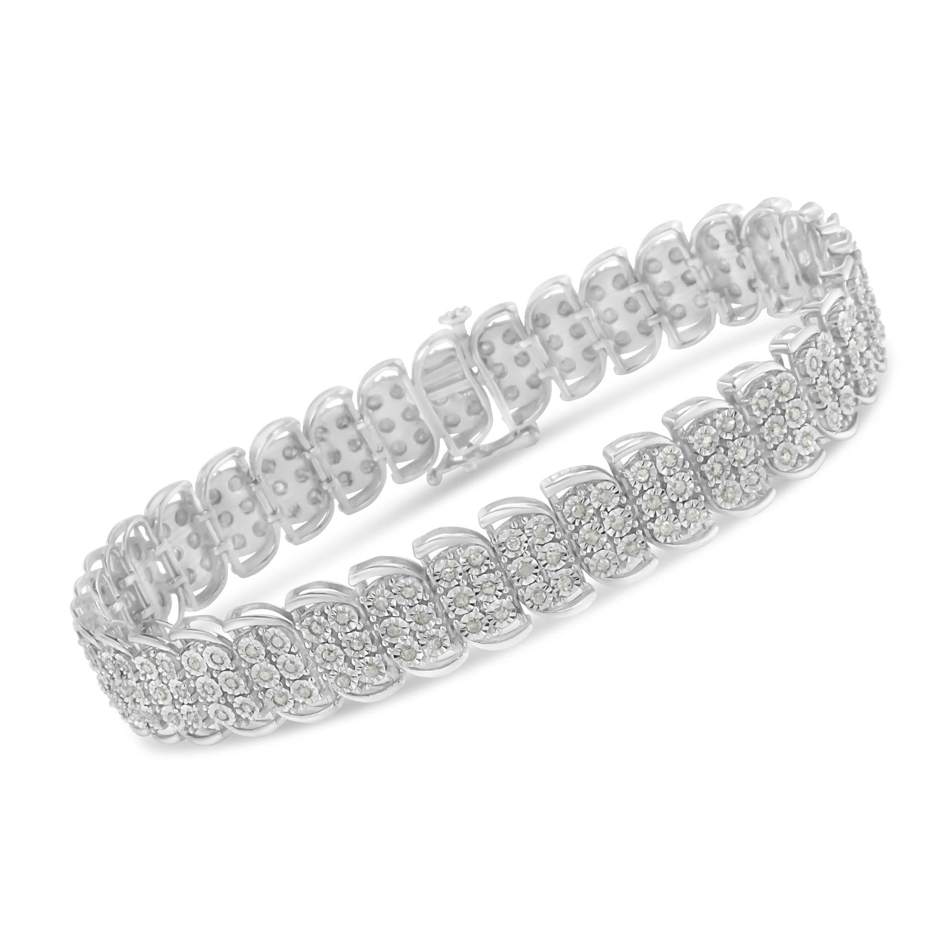 Illuminate her wrist with this stunning s-link bracelet. Crafted from the finest .925 sterling silver, this piece is embellished with 210 diamonds in a miracle setting. Weighing a total diamond weight of 2 carats, this bracelet is the perfect accessory for any formal occasion. Please note, the diamonds are rose-cut, promo quality which are on the lowest on the diamond color and quality scale. Rose-cut, promo quality diamonds are milky and cloudy in nature. They have asymmetrical ball shape and are filled with inclusions.