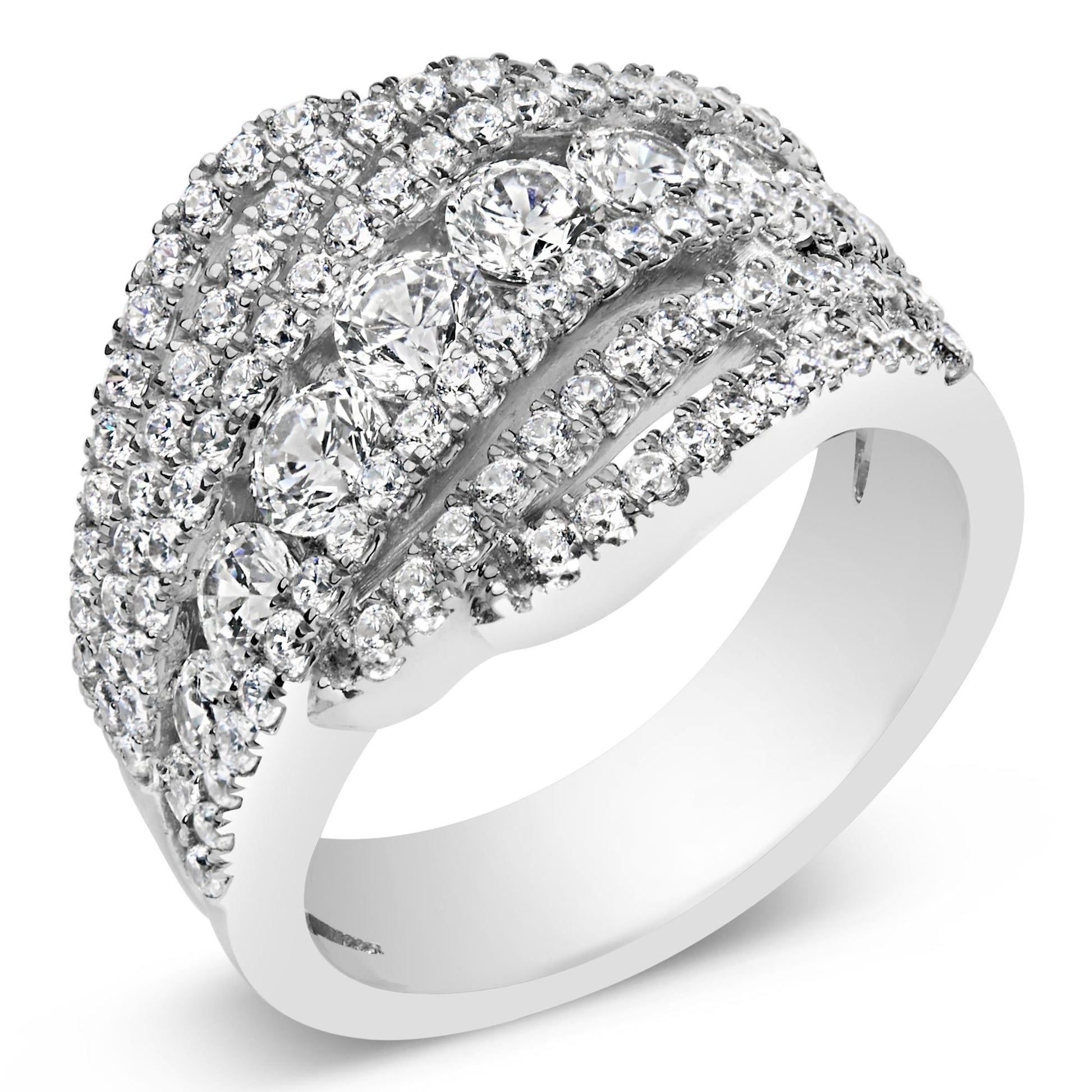 Immerse yourself in the elegance of this .925 sterling silver band ring, bathed in the sheen of rhodium plating for enduring luster and strength. At its heart lies a mesmerizing arrangement of nine round brilliant cut lab-grown diamonds, escalating gracefully in size to draw the eye to the center with undeniable allure. Each diamond, meticulously lab-created for perfection, sparkles with a promise of clarity and sustainability. Encircling this regal procession, six additional rows of petite diamonds cascade down the band, amplifying the light and luxury with every turn of your hand. This 2.0-carat total weight masterpiece offers a symphony of shimmer designed to celebrate the splendor of modern craftsmanship and ethical beauty. Let it be a symbol of sophistication and conscious choice adorning your finger.