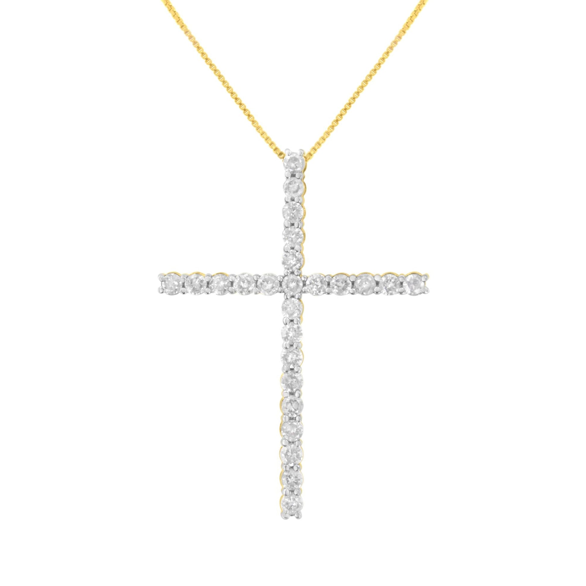 Share your faith with this stunning diamond cross pendant necklace. This cherished cross necklace for her, features 25 natural,round diamonds set in Sterling Silver. The pendant is suspended from an 18-inch box chain with spring ring. This fine jewelry cross necklace has a total diamond weight of 2 1/2 carats and is a contemporary classic. Color grade range is H-I and the clarity grade ranges from I2-I3.
