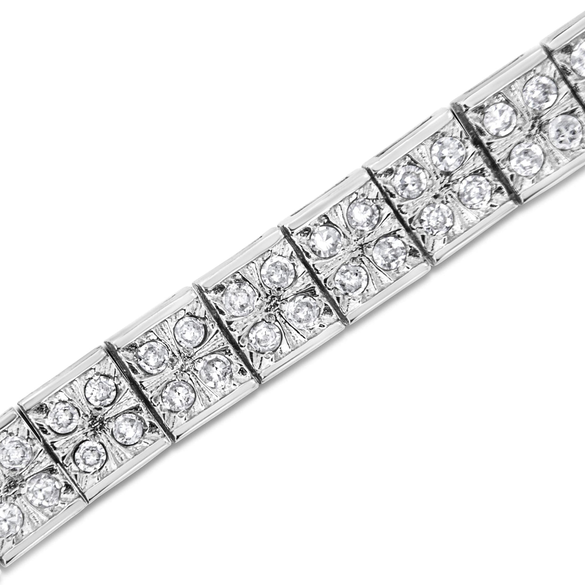 This beautiful link bracelet has a glamorous twist on a classic design. Square silver links are embellished with four stunning round-cut diamonds in an elegant prong setting. This authentic design is crafted of real 92.5% sterling silver that has been electro-coated with genuine rhodium (a platinum-family metal), a precious metal that will keep a tarnish-free shine for years to come. This bracelet has a total diamond weight of 2 carats, and is the perfect accessory for any formal event.