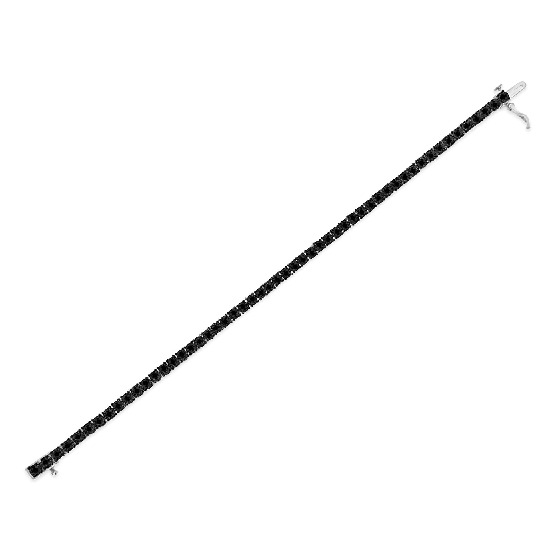 Elegant and timeless, this gorgeous pure 92.5% sterling silver tennis bracelet features 3.0 carat total weight of treated black color, round diamonds. The bracelet features unique illusion-settings with miracle-plates that center each genuine diamond in a mirror-finish, high-polish frame. Modern yet antique-inspired faceted bezel settings give the illusion of much larger stones, magnifying the sparkle. The 7”-7.25" bracelet has a box-with-tongue and safety clasp fastener and is crafted of real 925 sterling silver that has been electro-coated with genuine rhodium (a platinum-family metal), ensuring it will keep a tarnish-free shine for years to come. This sweet bracelet makes a perfect Valentine's Day gift, or as a way to remember someone close to your heart. It's a classic and feminine piece she'll want to show off every day. Whether worn for daytime glamour or evening sparkle, this bracelet is gorgeously versatile. Give her a gift that will perfectly complement almost any ensemble.
