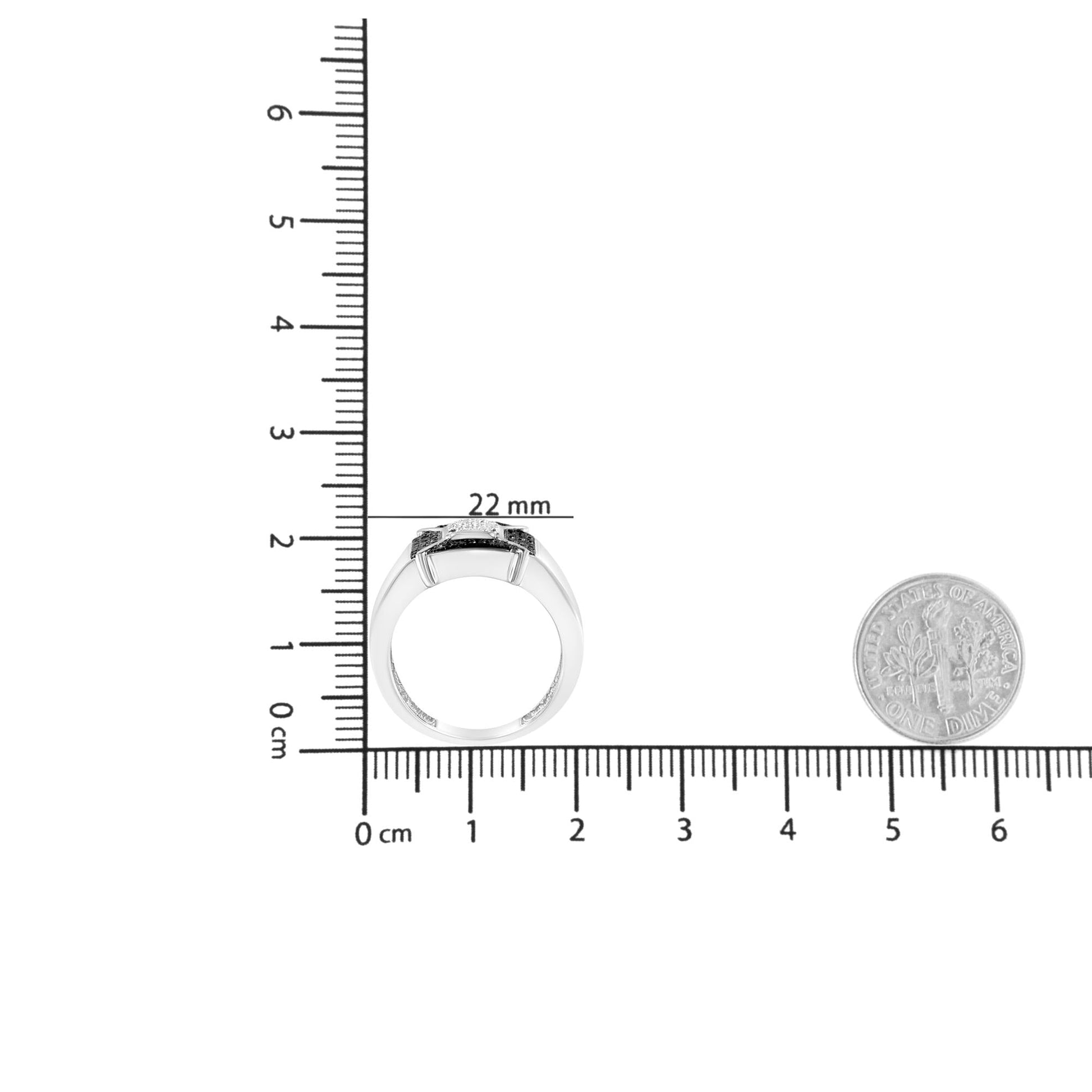 Create a debonair look for him with this handsome diamond ring. This bold ring design is crafted in sterling silver and showcases 3/8ct TDW of shimmering black and white round cut diamonds. Black diamonds set in black rhodium create the perfect backdrop for a white diamond cluster to sit on and become the centerpiece of the ring. A polished silver band gives the finishing touch to this piece. Captivating with 3/8 ct. t.w. diamonds and a brilliant buffed luster, this ring is certain to delight the one you adore.