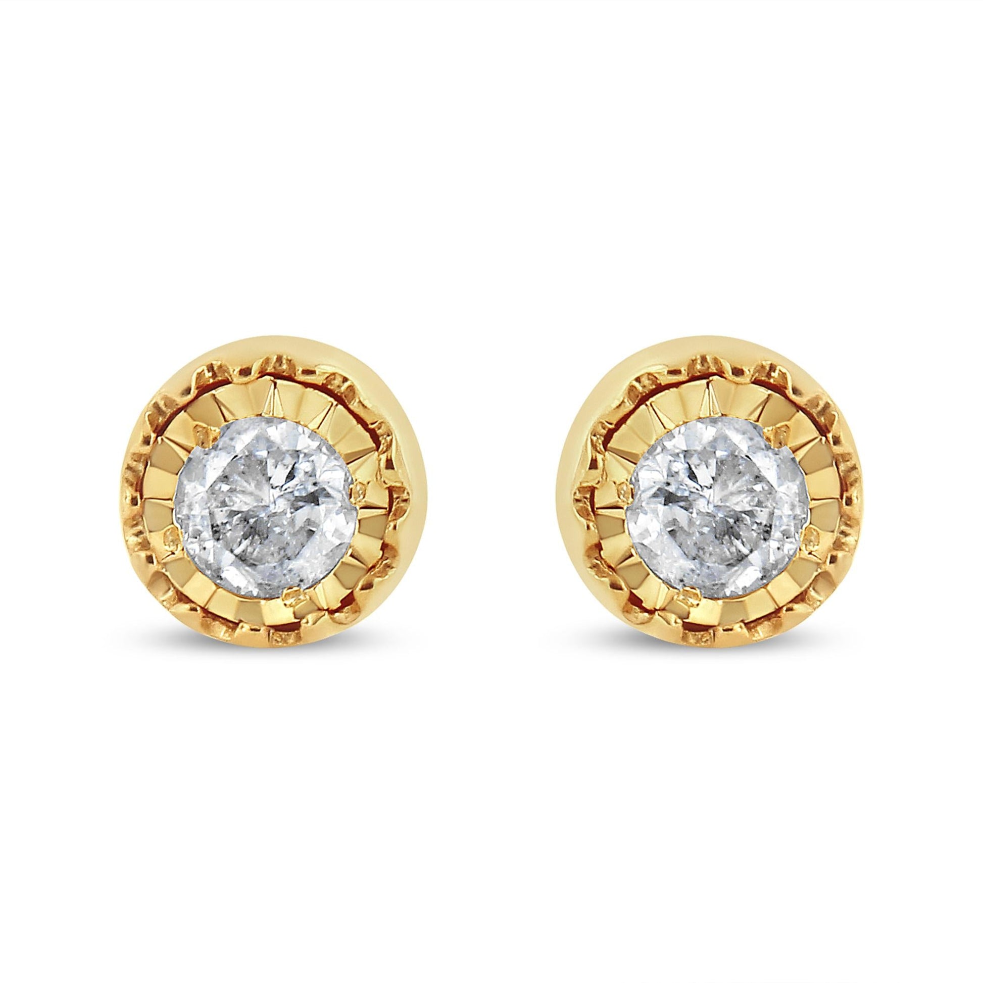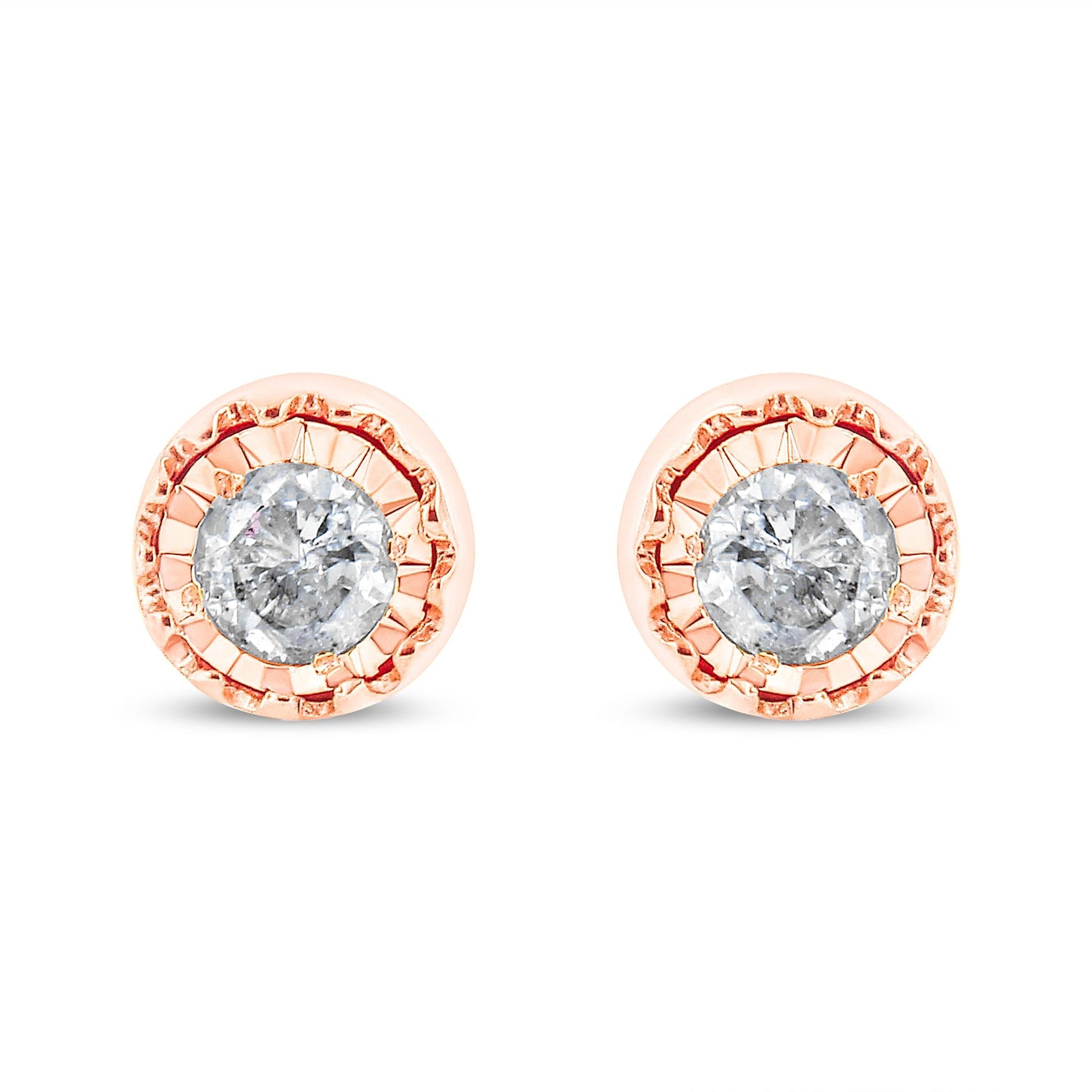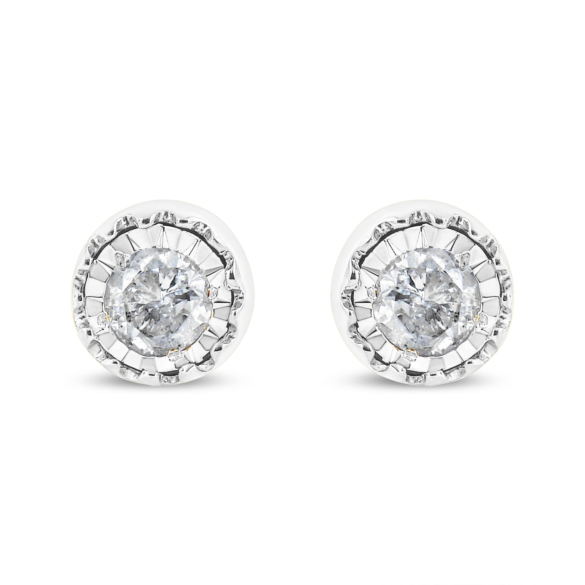 Look effortlessly chic and sophisticated for any occasion when you walk into a room wearing these stunning solitaire diamond stud earrings. Immortalized in fine .925 sterling silver, this pair presents a gorgeous sparkle with round white diamonds in a total 3/8 cttw and an approximate I3 clarity and J-K color. The unique miracle-plate setting centers each genuine diamond in a mirror-finish, high-polish frame, giving the illusion of a much larger stone. This look secures with push back findings for easy wearing.