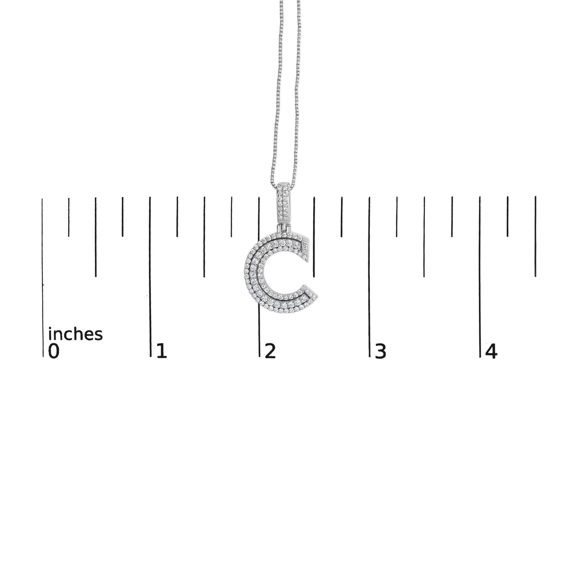 Imbued with modern elegance and radiant charm, this pendant necklace captivates at first glance. Crafted from lustrous .925 sterling silver, the form of the letter "C" is meticulously outlined with two rows of shimmering lab-grown diamonds. These ethically sourced stones, weighing in at 0.85 carats, flaunt an F-G color and VS2-SI1 clarity, reflecting light with every movement to create a breathtaking sparkle. The sophistication extends to the bail, which is embellished with a continuation of the dazzling pave setting, seamlessly connecting the pendant to a delicate 18-inch box chain. This piece isn't just jewelry; it's a statement of style and a testament to the advances of technology in gemstone creation, offering both beauty and responsibility in each finely crafted detail. Perfect for those cherishing personalized touches with environmental consciousness.