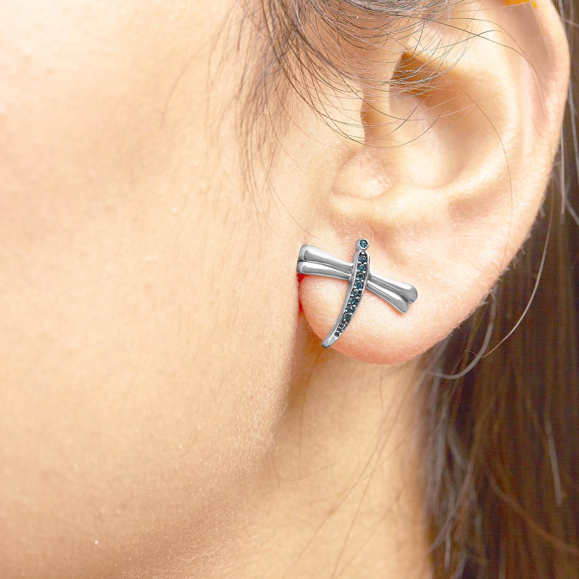 Grace your ears with the enchanting allure of these sterling silver dragonfly stud earrings, each wing fluttering with the azure brilliance of treated natural diamonds. Earth-mined, these blue gems capture the whimsy of nature's transient beauty, polished with rhodium plating to ensure lasting luster. The delicate framework of .925 sterling silver forms the ethereal silhouette of a dragonfly, with I2-I3 clarity diamonds glistening along its slender body, offering both charm and a subtle hint of opulence. Perfectly secured by push backs, these earrings promise comfort paired with exceptional elegance, making them a truly exquisite addition to any jewelry collection.