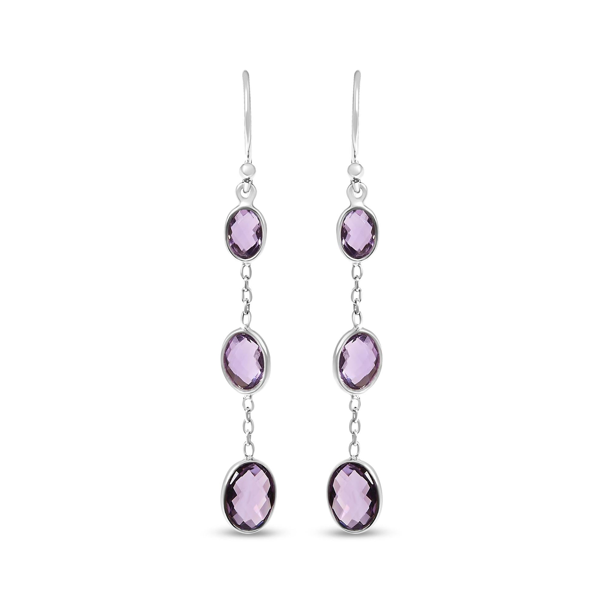 Discover a radiant symphony of color and craftsmanship with this stunning pair of drop earrings, featuring natural purple amethysts with an enchanting checkerboard cut that dances in the light. Each of the three oval gemstones sparkles within a secure bezel setting, ensuring both protection and prominence. Crafted from rhodium-plated .925 sterling silver, these earrings boast not only a brilliant luster but also commendable durability. Untreated for a pure, resonant hue, these amethysts hang elegantly, about 2 inches in drop, allowing for eye-catching movement that accentuates your every gesture. A refined choice for those who cherish unique design and natural beauty, these earrings promise to elevate any ensemble with their graceful allure.