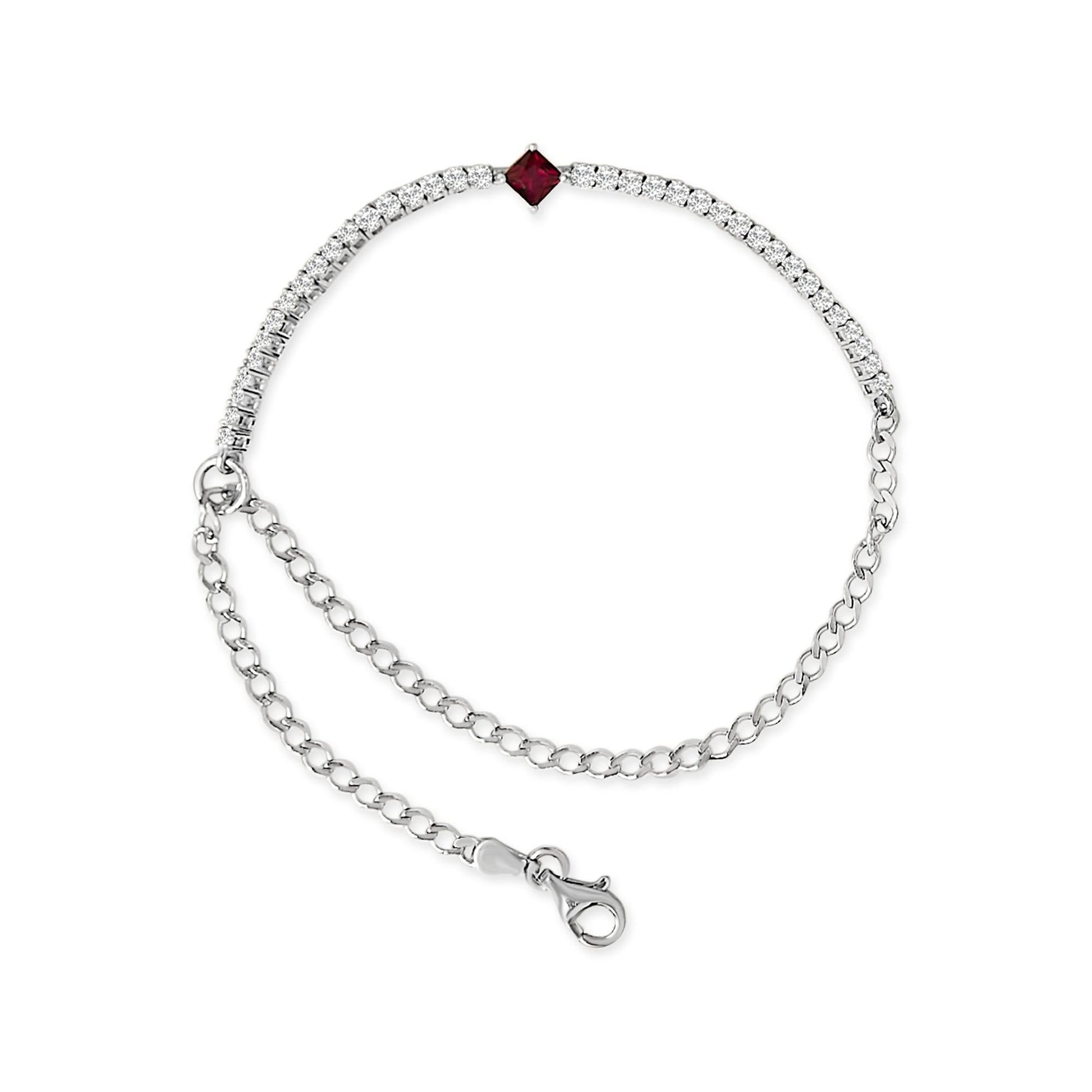 Embody elegance with this enchanting .925 sterling silver tennis bracelet, rhodium-plated for an everlasting gleam and supreme durability. Designed to dazzle, it features a regal 4x4 mm princess-cut ruby at its heart, surrounded by mesmerizing 2x2 mm white sapphires, each perfectly poised in a classic four-prong setting. These lab-created gems, known for their precise cut and breathtaking brilliance, offer a sustainable luxury, color-treated to achieve their vibrant hues. The innovative adjustable design with a lobster claw clasp seamlessly adjusts from 6.25 inches to 9.25 inches, ensuring a flawless fit for any wrist. The duality of sparkling gemstones and a sleek mesh chain blends sophistication with comfort, making this bracelet a versatile addition to any jewelry collection.