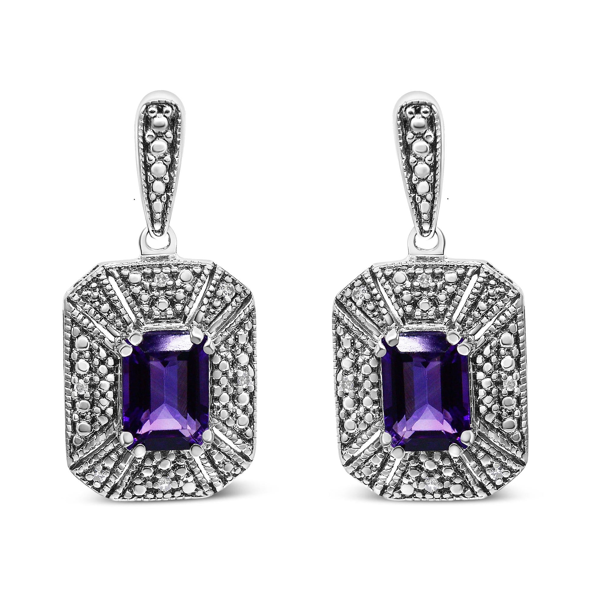 Let the rich color and sparkling grandeur of gemstones and diamonds accentuate your style when you wear these sensational .925 sterling silver halo stud earrings! At the center of each earring is a 7x5mm rectangular amethyst gemstone in a color-treated purple. Surrounding these faceted gems is an intricate textural pattern that sparkles with prong-set accent diamonds. These diamonds are of an approximate I-J color and I2-I3 clarity. These pierced dangle stud earrings secure in the ear via push back findings.