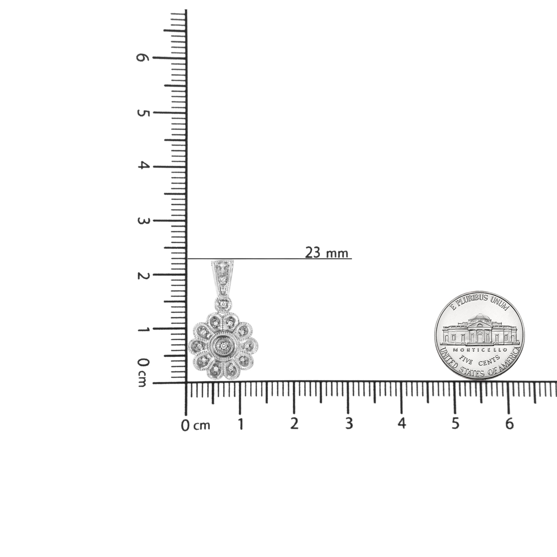 A fabulously stylish and simple milgrain finished Diamond Cluster Pendant showcases 13 single cut pave set diamonds, beautifully set to glowing perfection in floral motif. The pendant is crafted in sterling silver and suspends gracefully from a cable chain. Total diamond weight is 1/20 ctw.