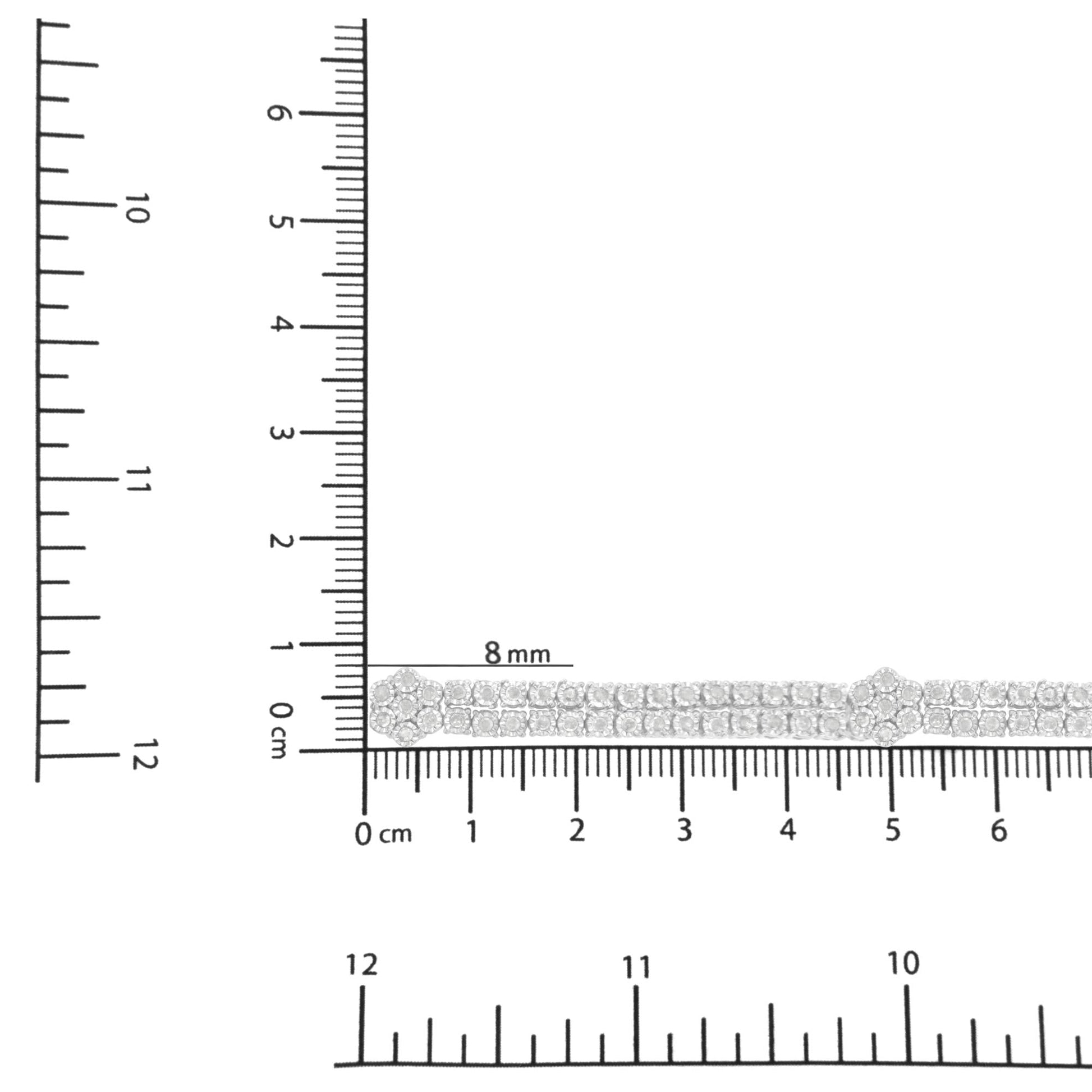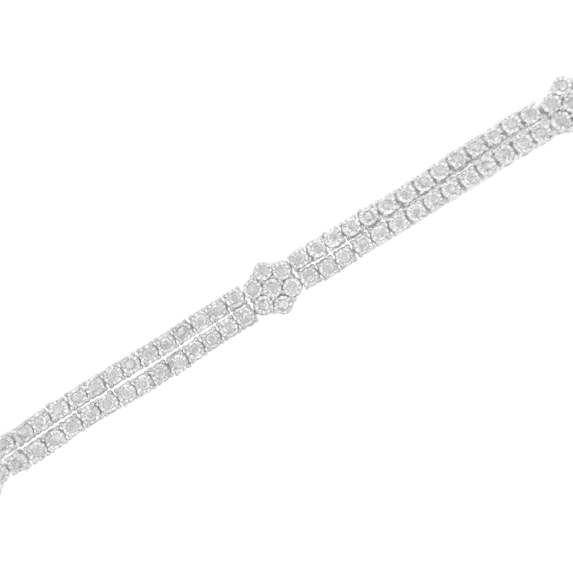 This elegant sterling silver bracelet features 2ct TDW of glittering diamonds. A central round cut diamond flower cluster sits as the centerpiece of this design. Two rows of miracle set round diamonds complete the bracelet. This piece fastens securely with a box clasp.