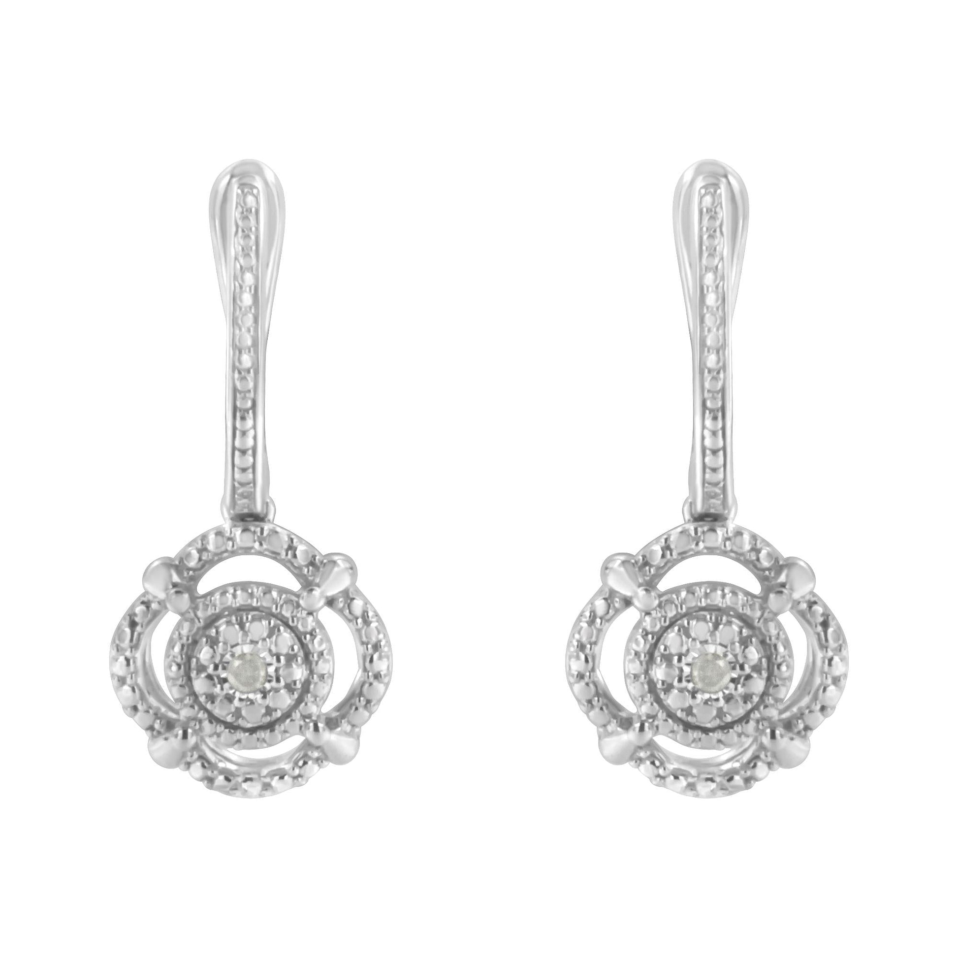 Elegant and timeless, these gorgeous sterling silver diamond dangle earrings feature natural, earth-mined diamonds set proudly at the center of the circular embellishment at the heart of the drop. These genuine stones are graded at I3 clarity, which is at the lower end of the diamond clarity grading scale; they may appear more cloudy than the photo shows, with visible natural inclusions. Each cushion shaped drop charm hangs from a U shaped, hinged clip. The front of the hoop earring, the open cushion shaped drop frame, and the circle at the center of the dangle are all adorned with highly polished, rounded, diamond mimicking studs. The locking clip style posts are perfect for pierced ears. This classic versatile pair of drops are the perfect gift for any occasion or milestone!
