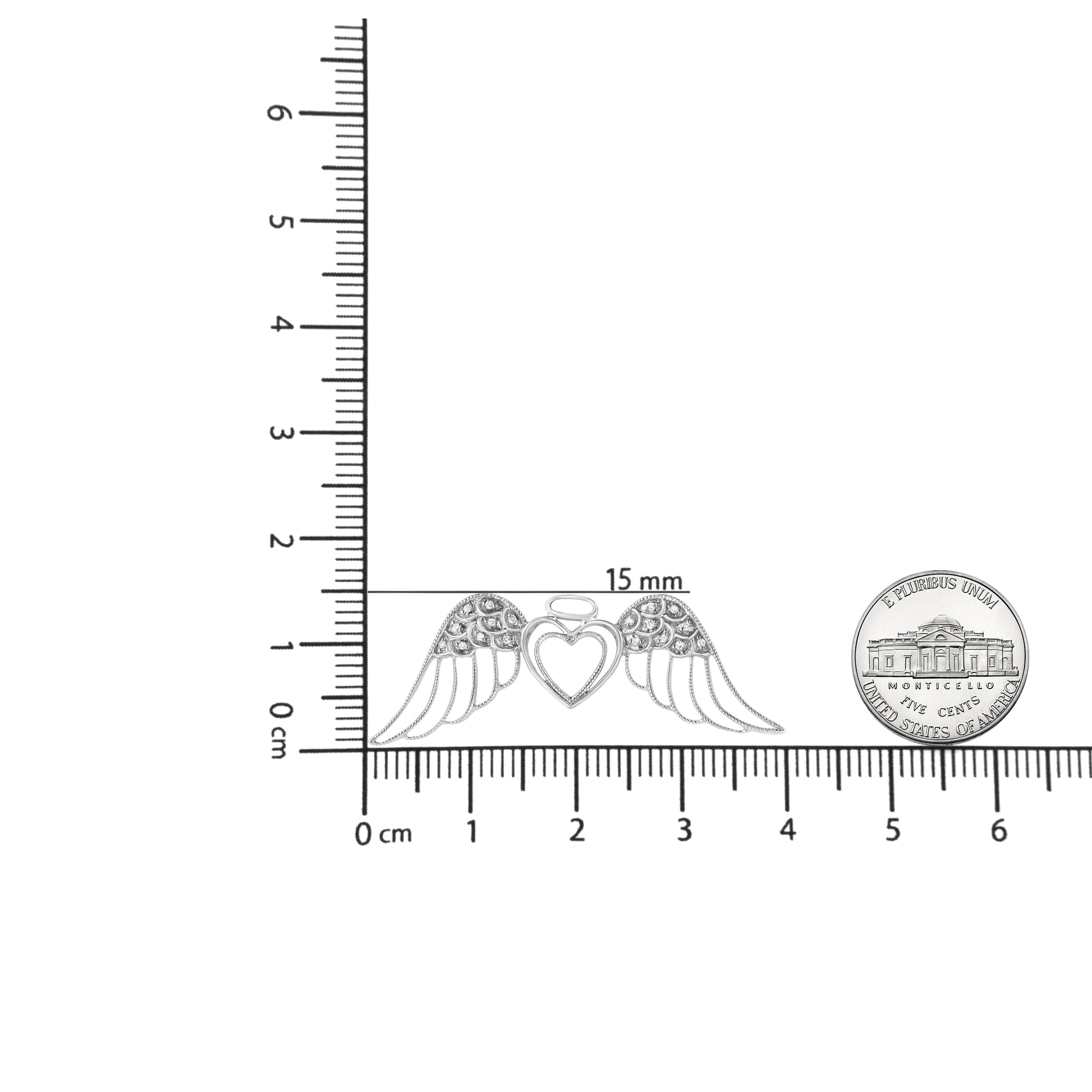 Present this sweet and stylish designed diamond angel wings to her. This sterling silver pendant features a glistening heart flies on brightly polished widespread angel's wings embellished with 18 pave set round cut diamonds. This whimsical pendant hangs from a beautiful cable chain. Total diamond weight is 1/20 ctw.