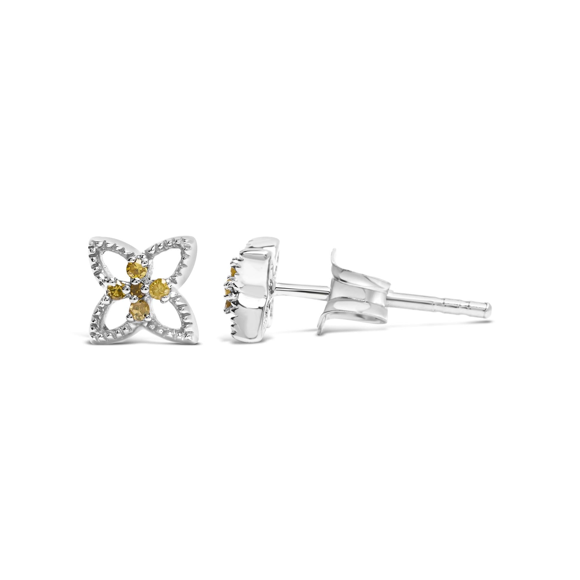 Crafted from luminous .925 sterling silver, rhodium plated for extra brilliance and resilience, these exquisite stud earrings bloom with the allure of a four-petal flower, each delicately carved petal encrusted with radiant, color-treated yellow diamonds. These natural gems, boasting an SI1-SI2 clarity, shimmer intensely, capturing the essence of a sunlit garden. Secured with a push-back closure for comfort, these earrings are a celebration of elegance and vibrancy, designed to enchant and add a touch of springtime to your attire, be it day or night.