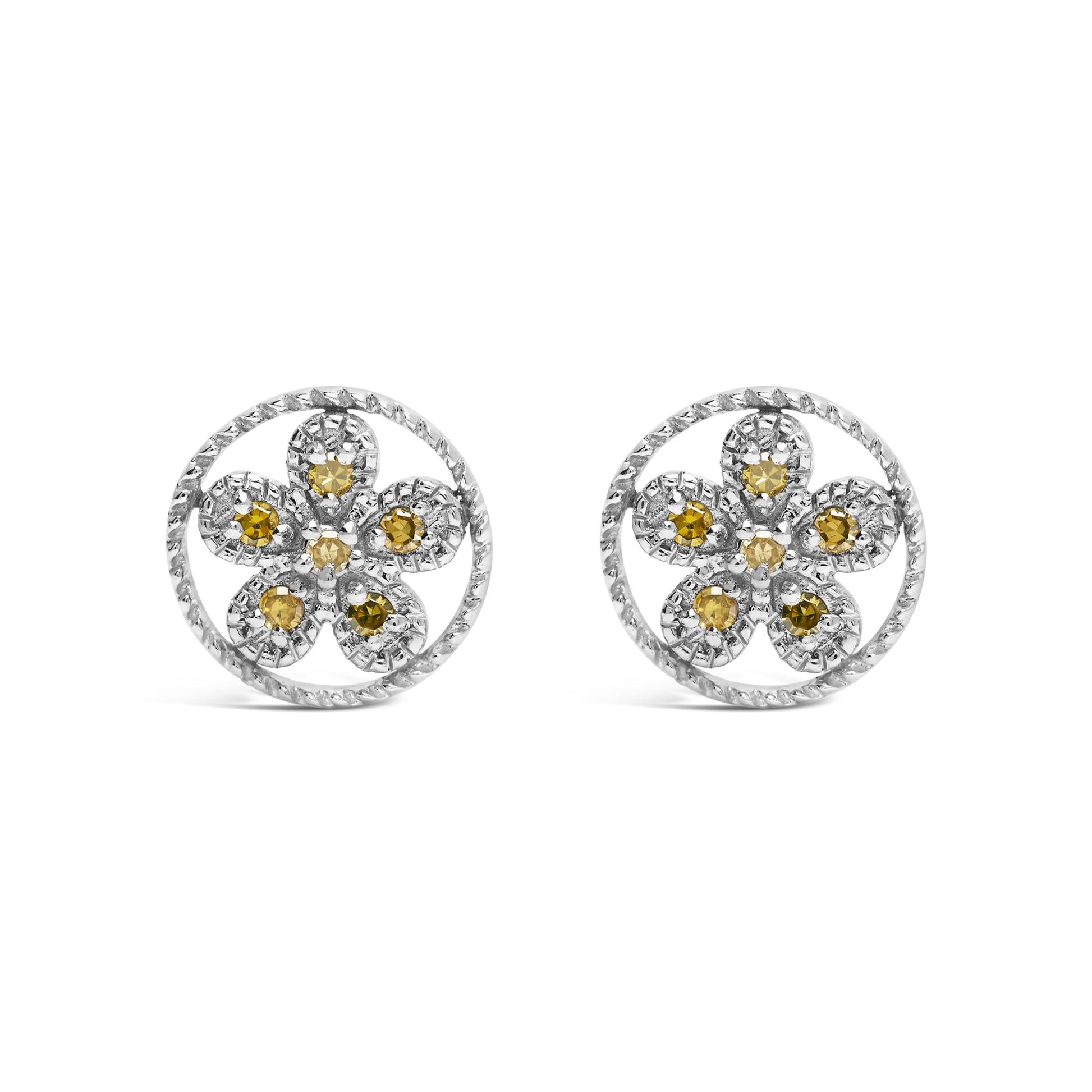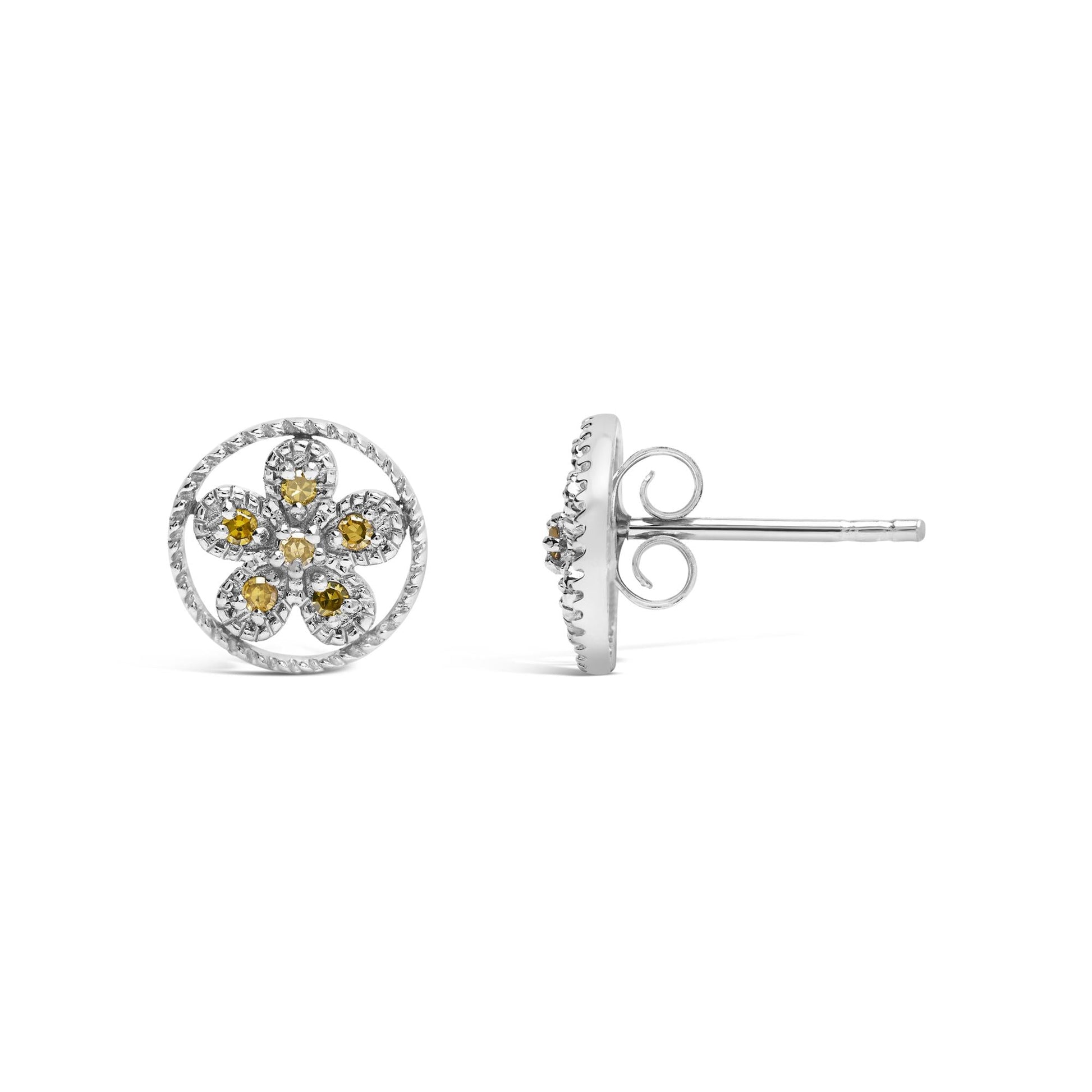 .925 Sterling Silver Yellow Diamond Accent Star and Wheel Milgrain Style Stud Earrings (Yellow Color, I2-I3 Clarity)