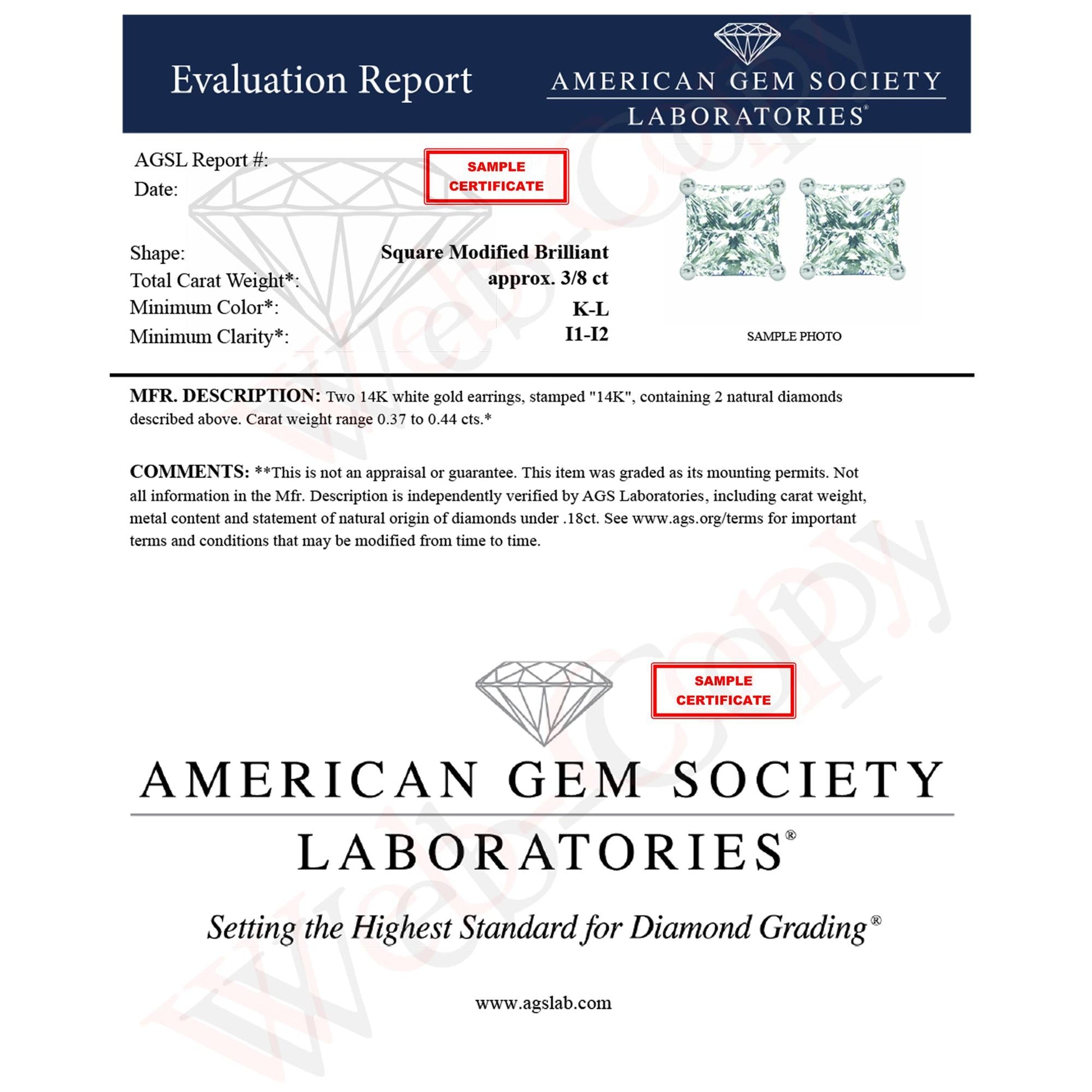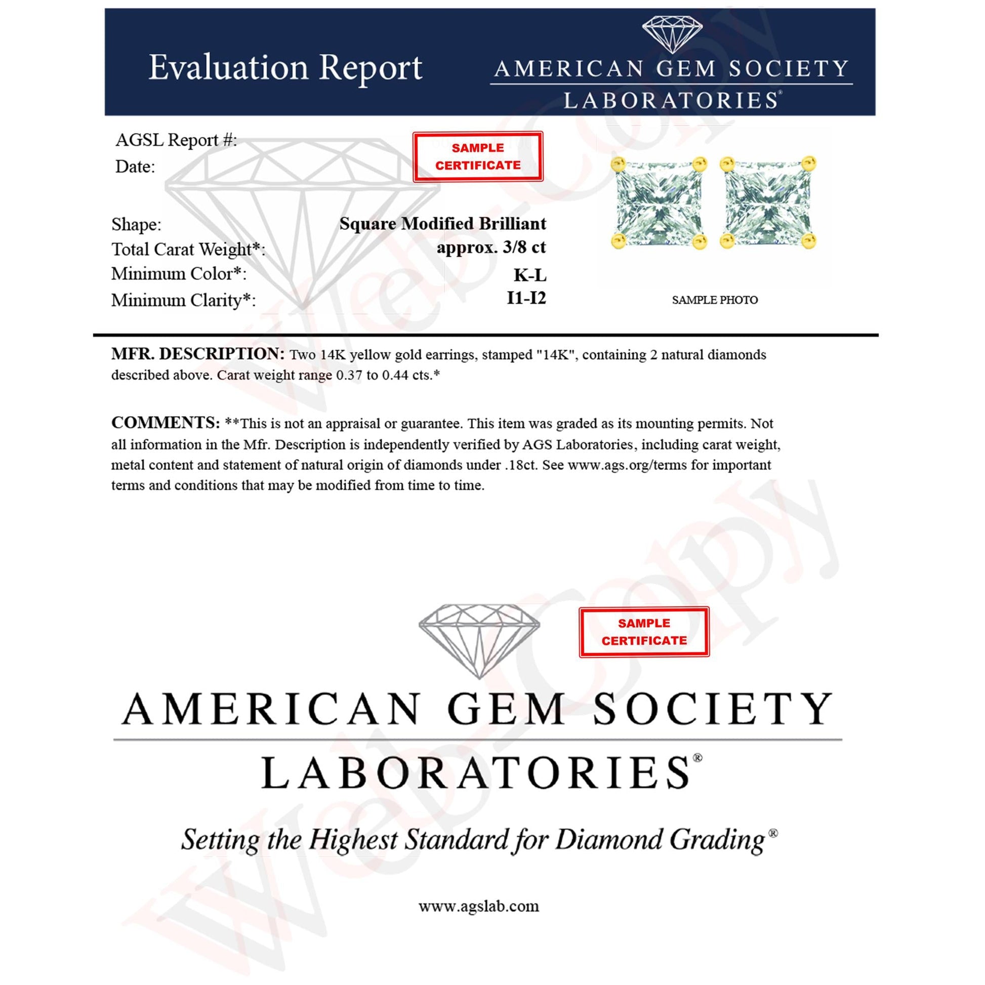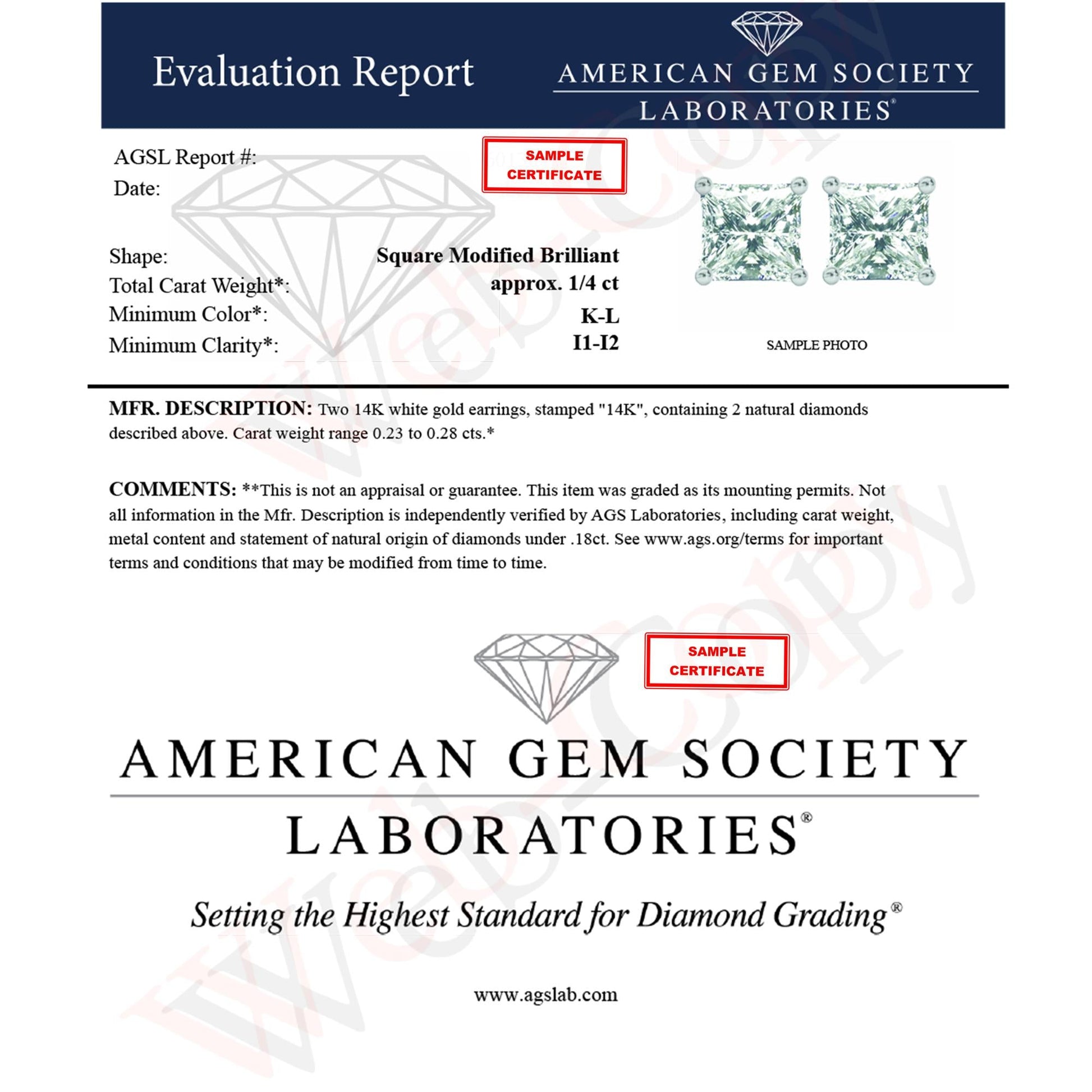 AGS Certified Princess-Cut Square Diamond 4-Prong Solitaire Stud Earrings in 14K Gold (L-M Color, I1-I2 Clarity)