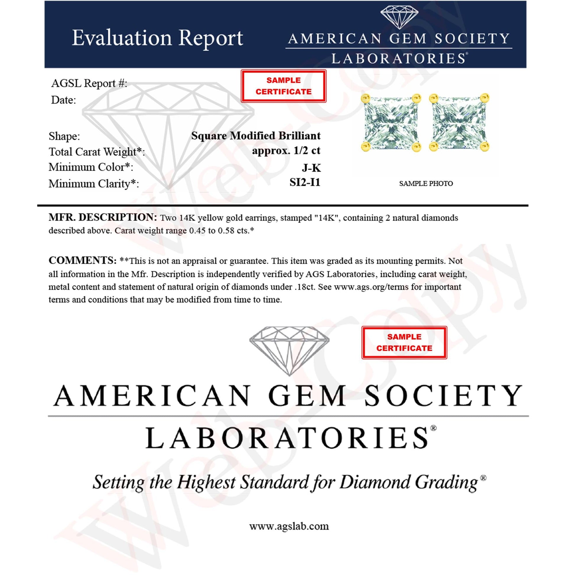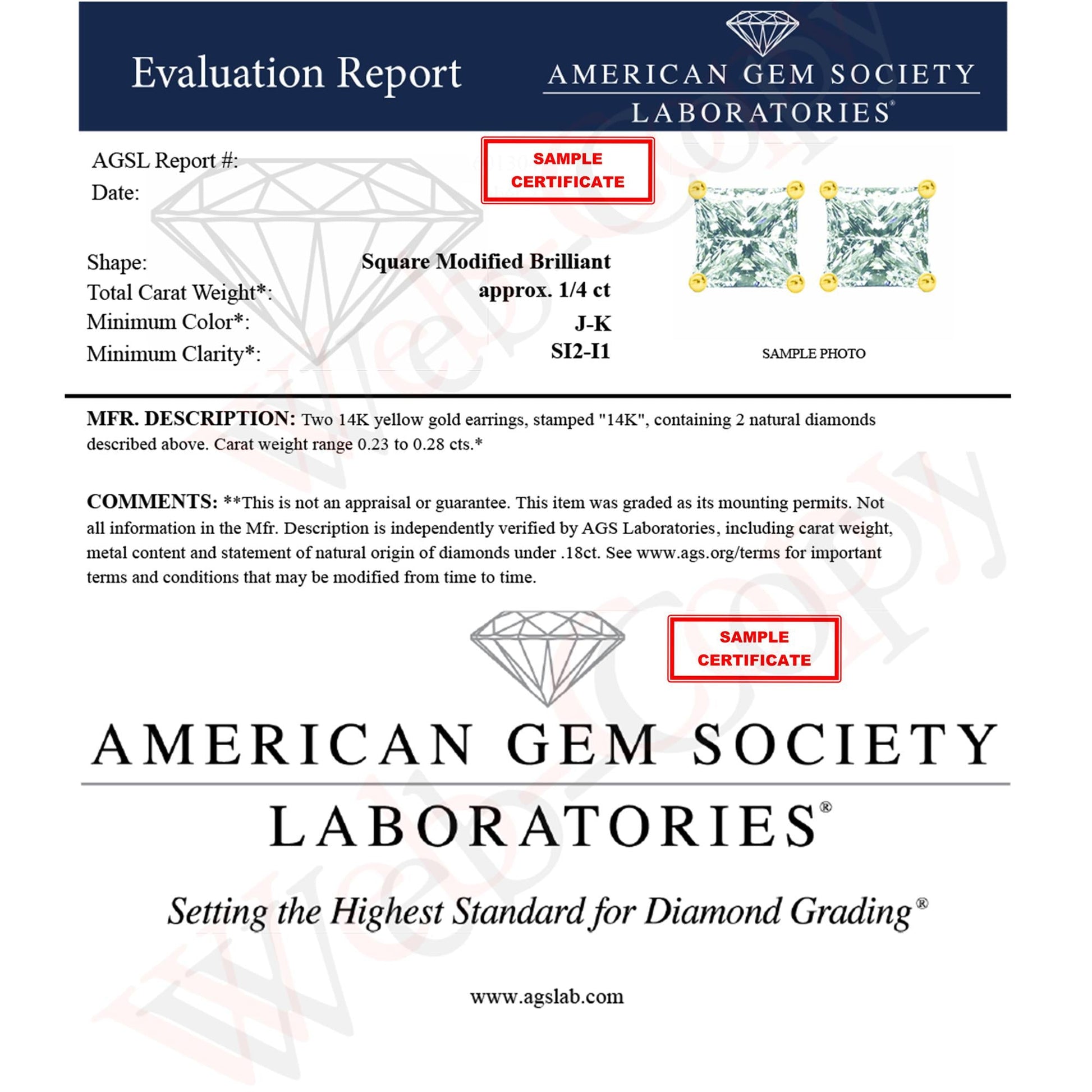 Celebrate any occasion with these classic shimmering diamond stud earrings. Fashioned in 14K yellow gold, each earring showcases a sparkling square shaped, brilliant cut certified diamond solitaire. Dazzling with a bright polished shine, these post earrings secure comfortably with friction posts and butterfly backs. These diamond studs are certified by the AGS as natural, earth mined diamonds. This authentic design is crafted of real 14 karat gold, a precious metal that will keep a tarnish-free shine for years to come. These classic earrings make a great gift for any special occasion! Whether worn for daytime glamour or evening sparkle, these studs are gorgeously versatile. Coordinate these earrings with your favorite diamond necklace or other diamond jewelry to create a complete elegant ensemble.